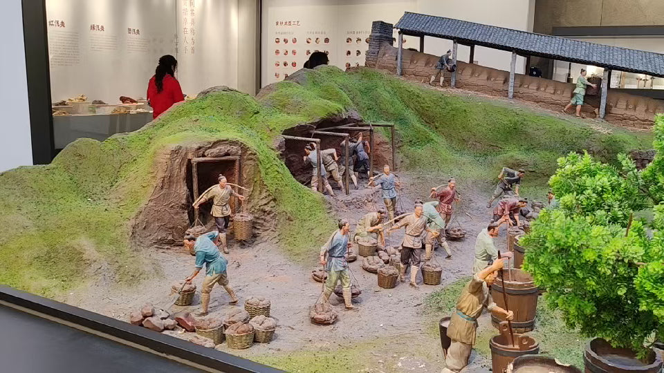 紫砂壶的传统制作工艺:采矿与泥料准备拣选原矿 → 风化处理 → 粉碎过筛 → 加水拌和 → 反复练泥 → 陈腐养护制胚与成型打制泥条 → 围筑壶身 → 制作壶嘴、把手、钮盖 → 用明针修整 → 刻印落款 → 阴干定型烧制与完成装入匣体 → 高温烧成 → 自然冷却 → 整口抛光———(视频取自宜兴丁山陶瓷博物馆:宜兴在明清时代的紫砂及陶器制作场景)