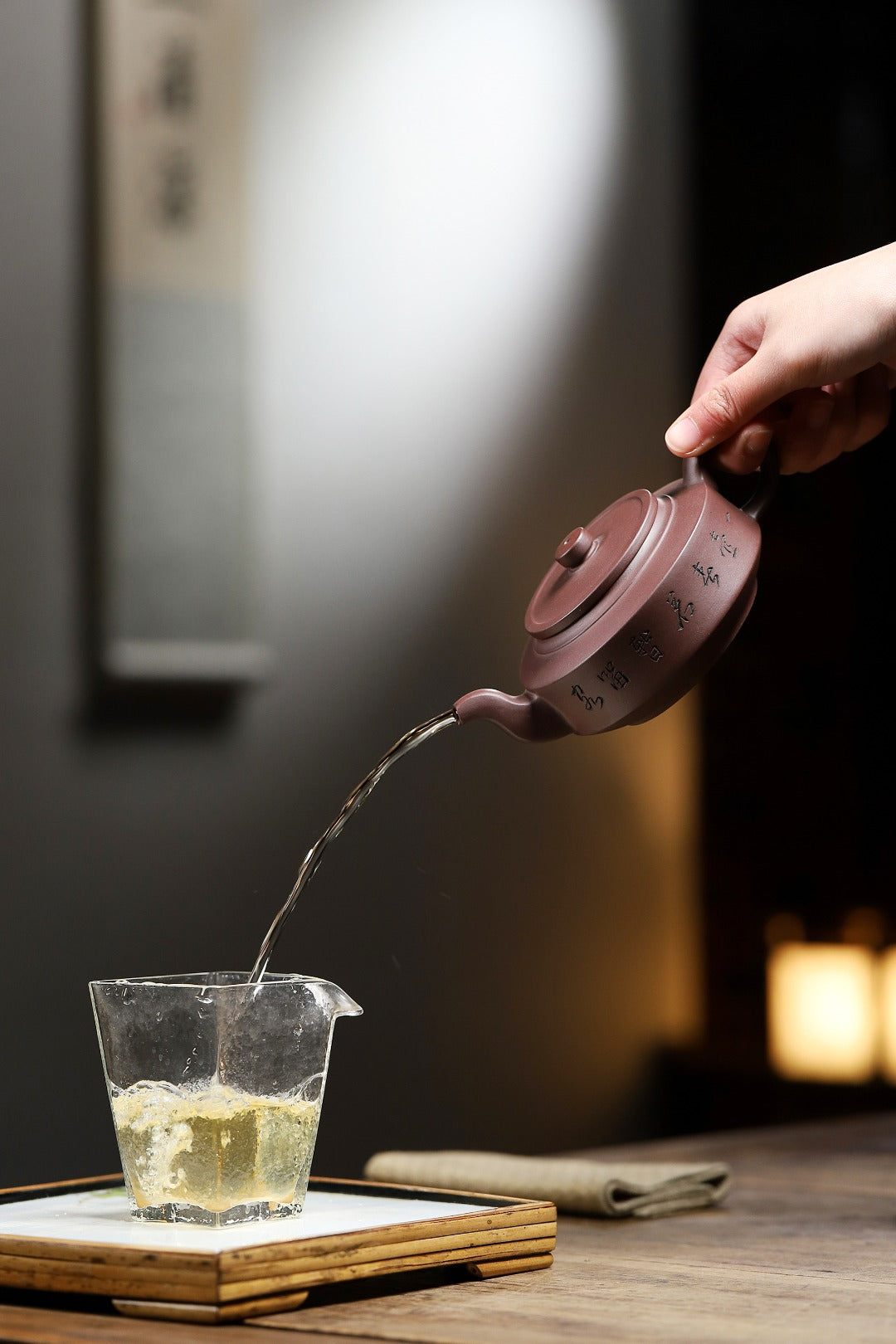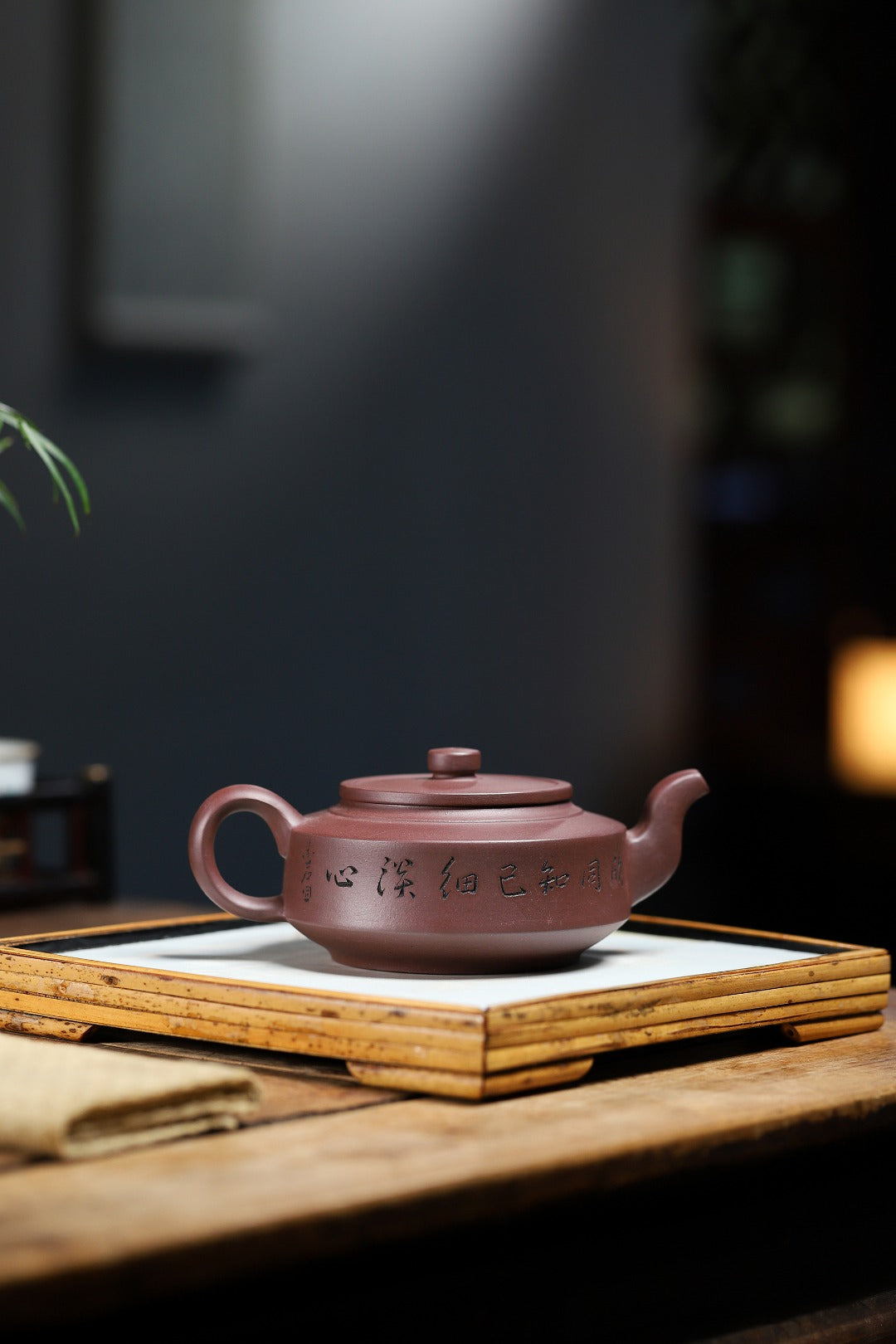 壶体形制简洁大方,磨盘壶身敦厚稳重,圆盘壶盖层次分明,嘴把线条流畅润泽,整器称得上一个“雅”字,壶韵很是充沛。