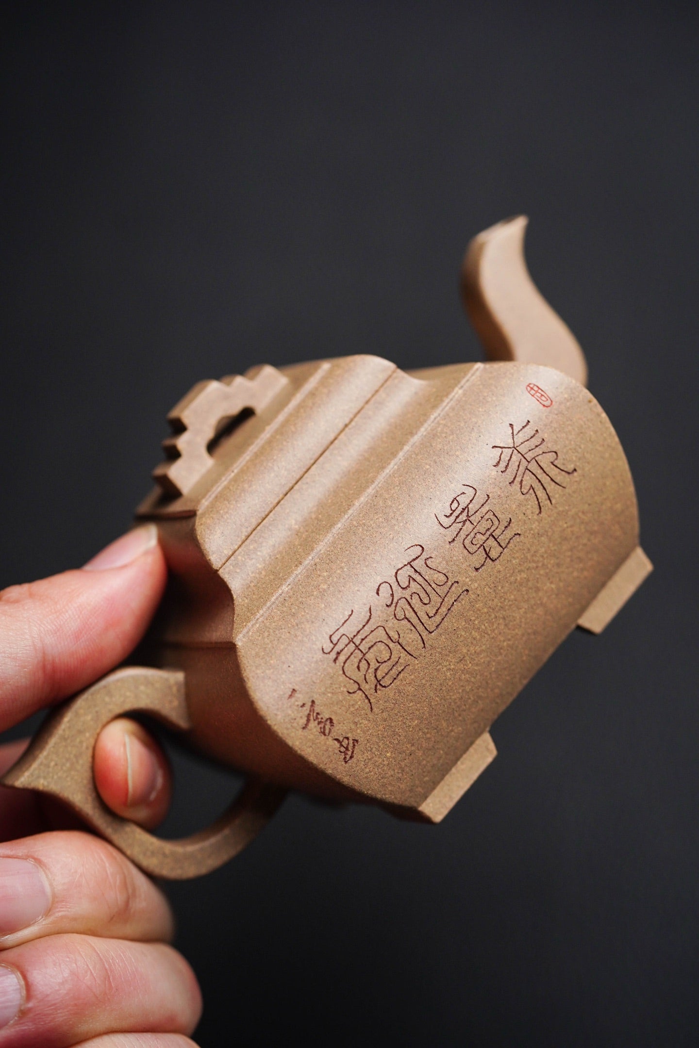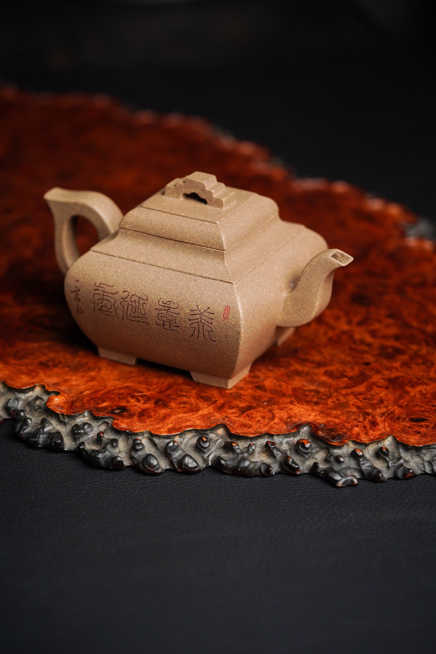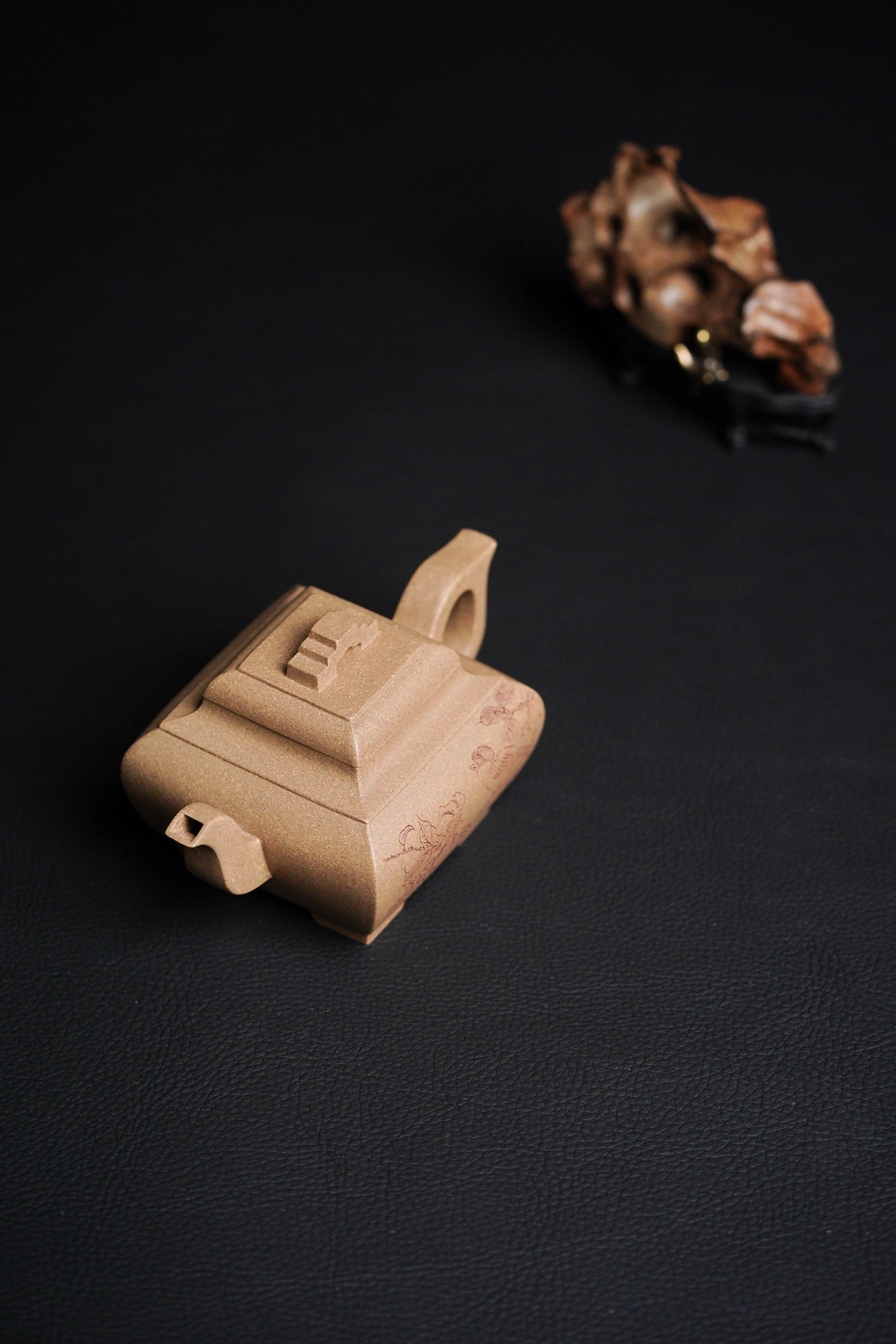 以桥形为钮的紫砂壶,壶底为四方形,壶身棱线呈弧度向上收缩,方圆结合。壶盖四方,敦厚如础。