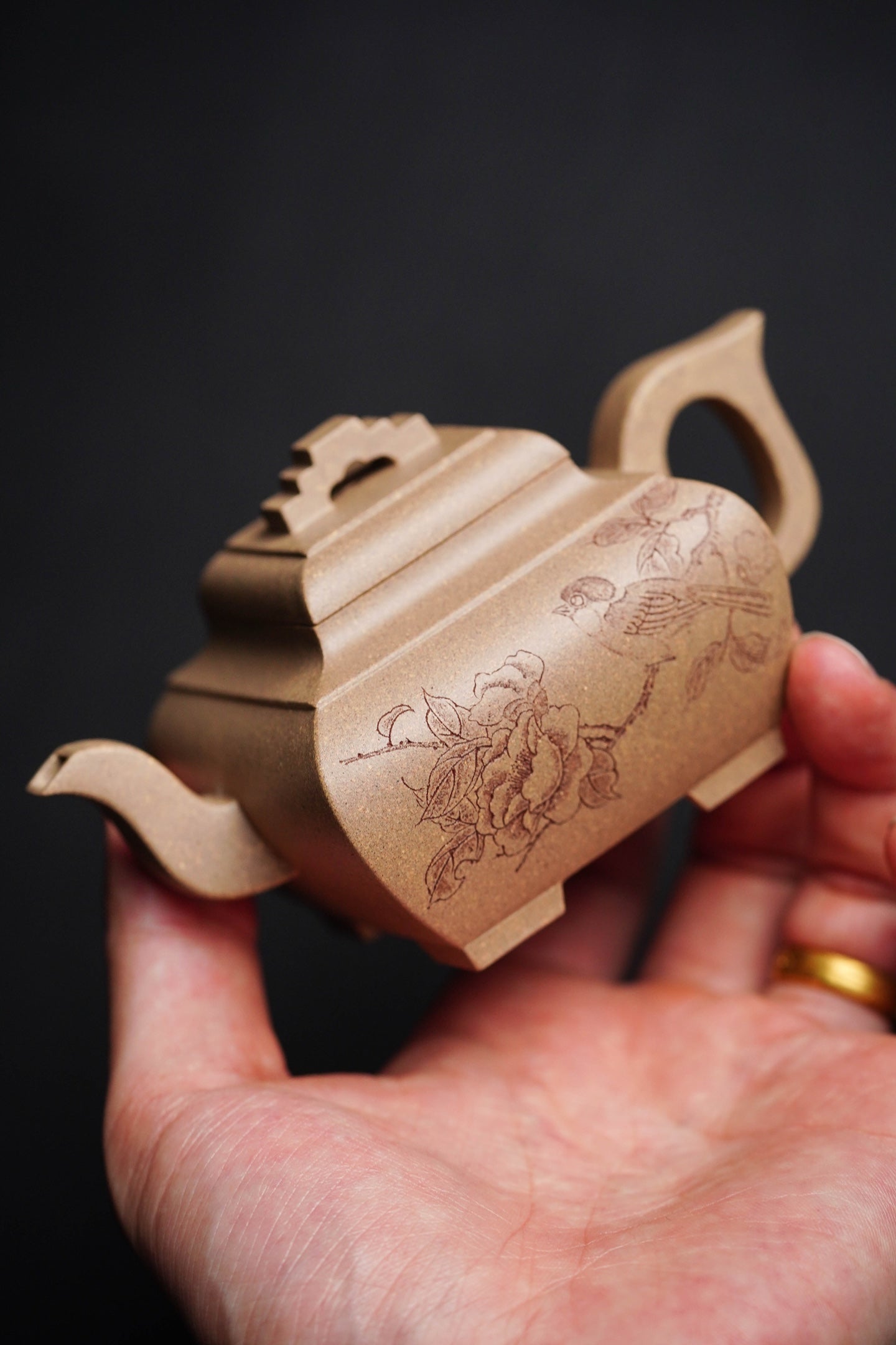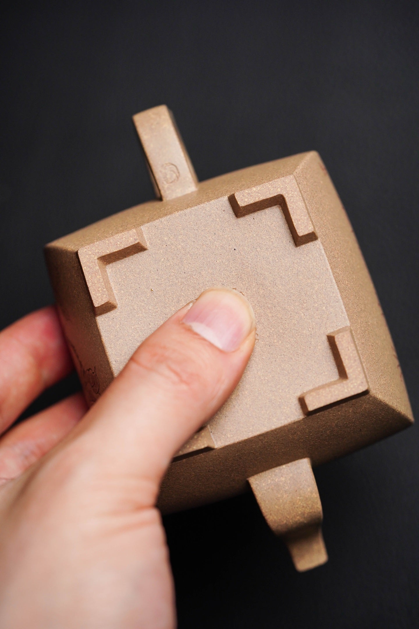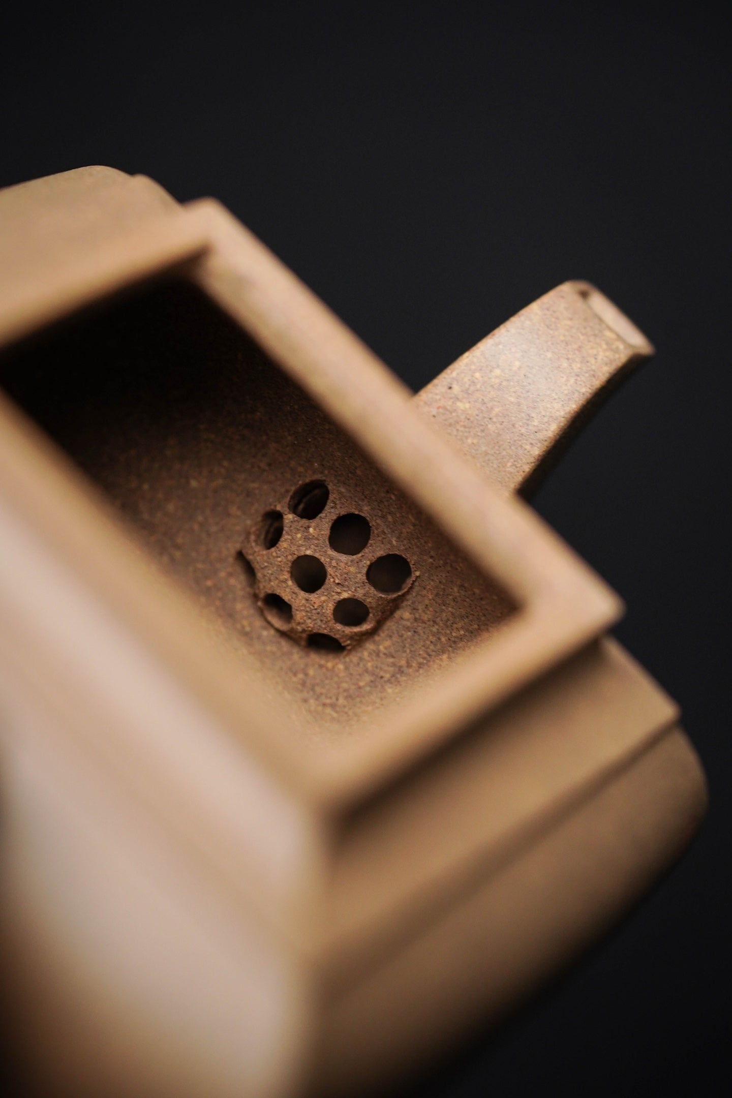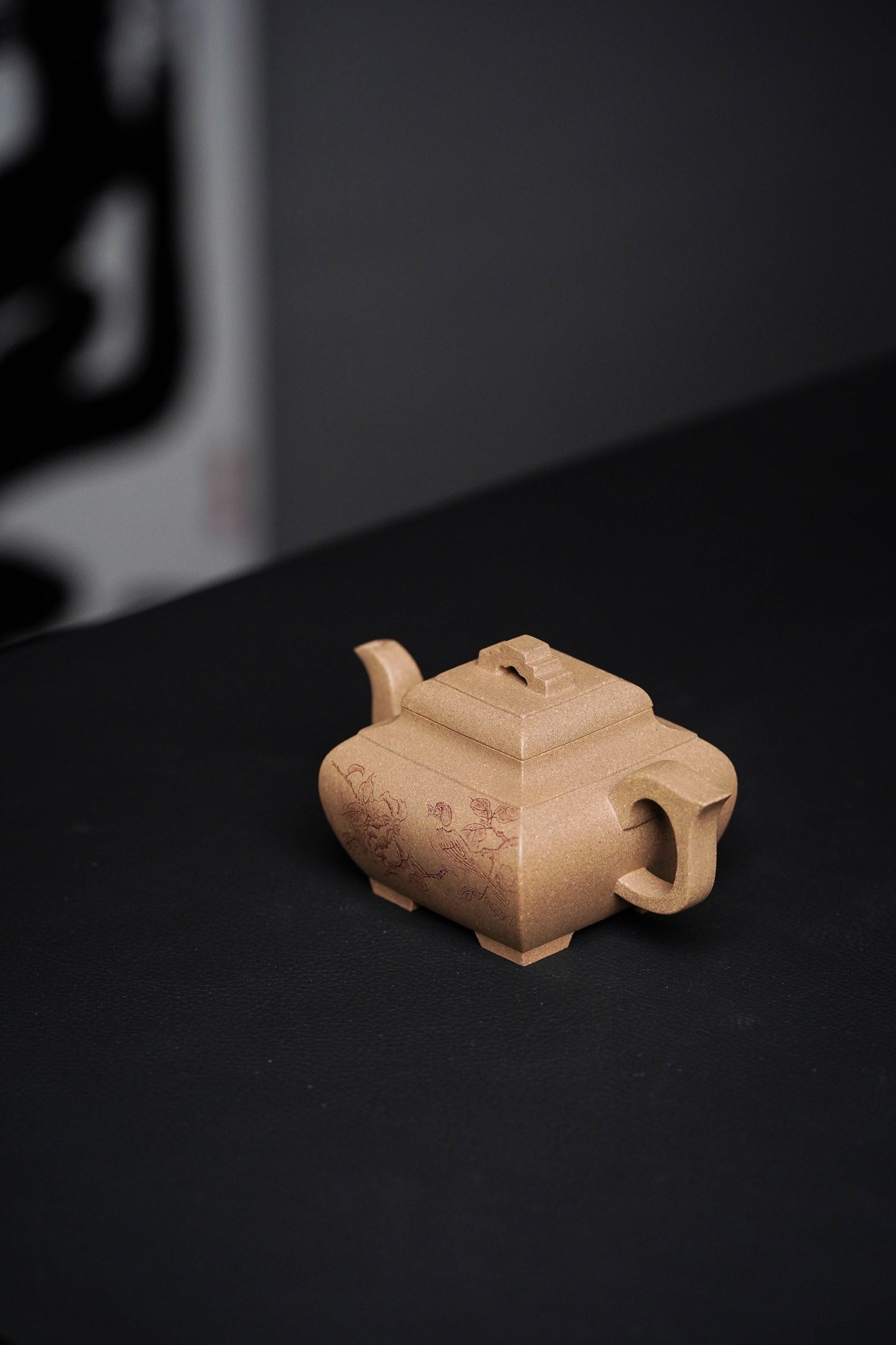 以桥形为钮的紫砂壶,壶底为四方形,壶身棱线呈弧度向上收缩,方圆结合。壶盖四方,敦厚如础。