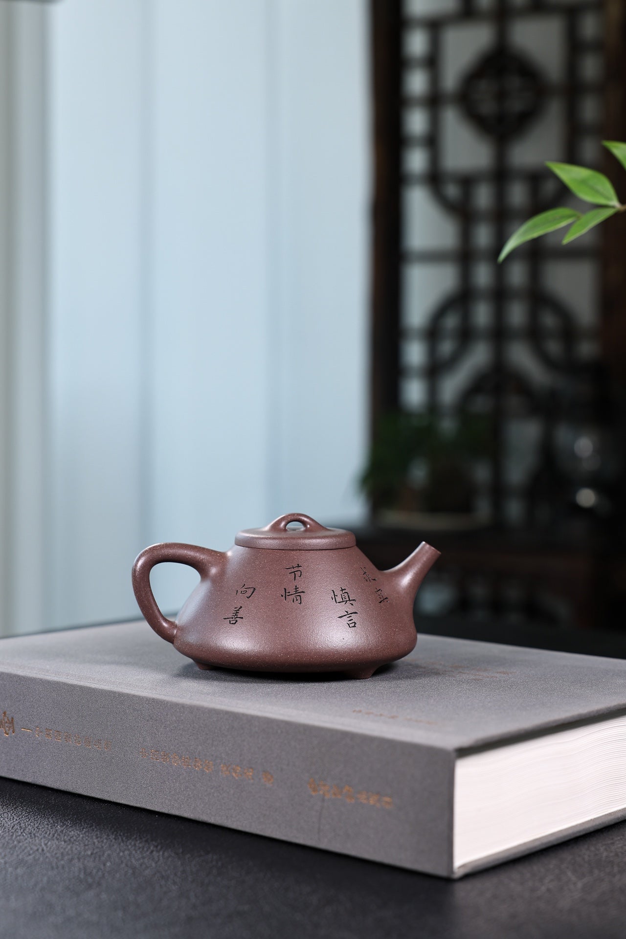 此壶做工精雅,器身陶刻书铭,以写意风格刻画出醇厚浑融的金石味道,融合子冶独有的清隽之气,颇有出尘之意。