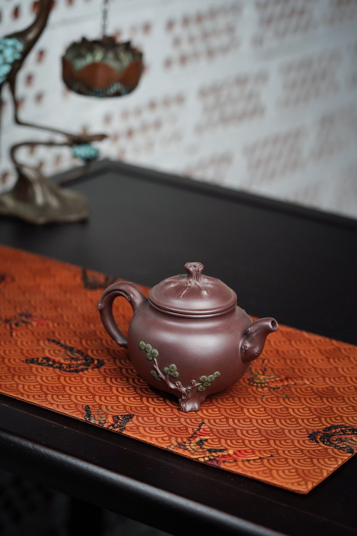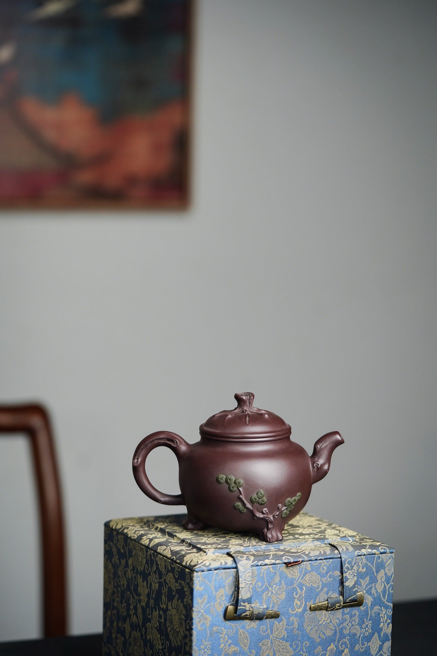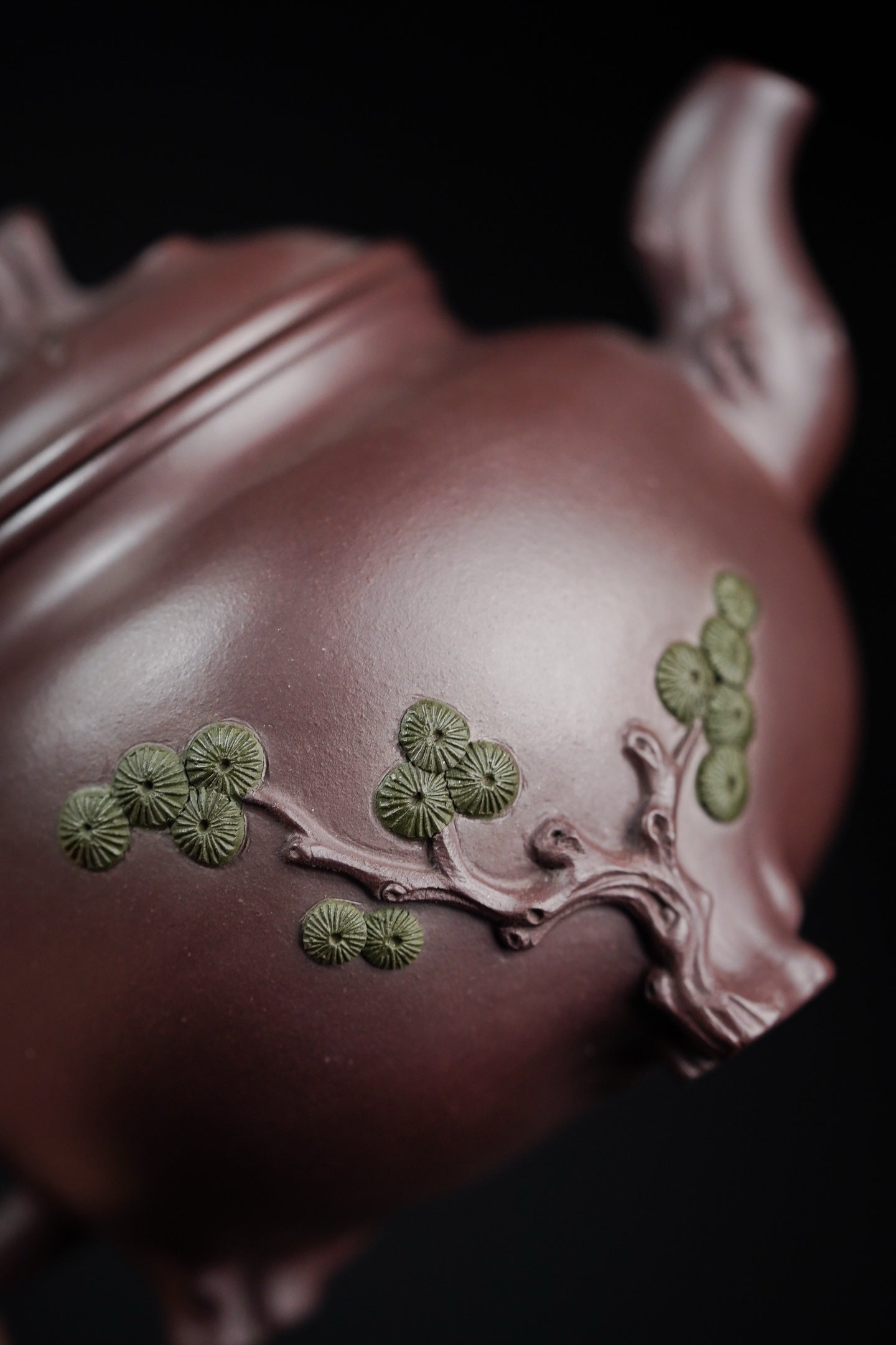 把梅桩的老辣生命力与松的劲道展现的尤其到位,梅花尽显层次感,枝干化作壶流与把壶,好似从树桩中生长出来一般,一气呵成的苍劲生命力。