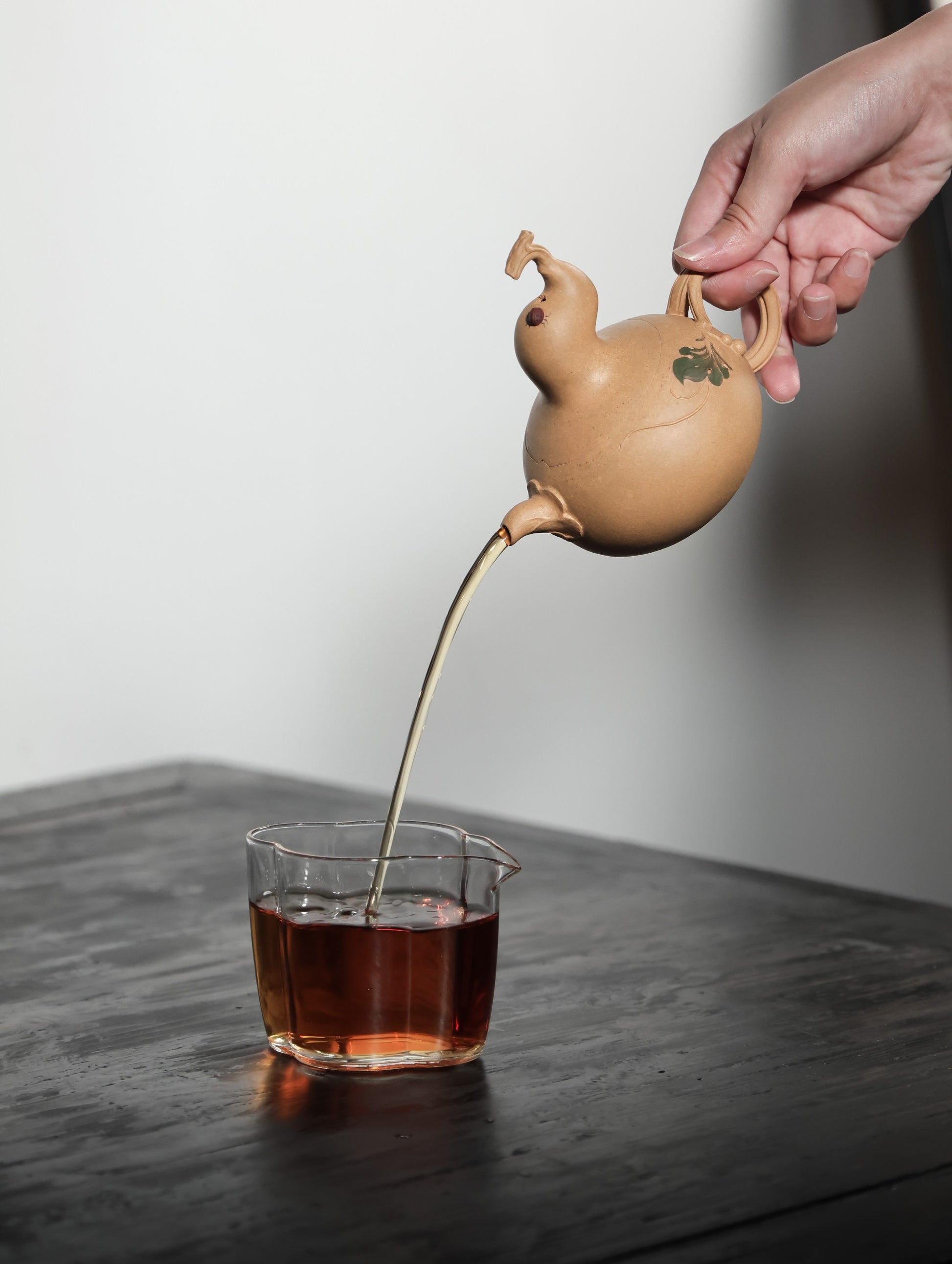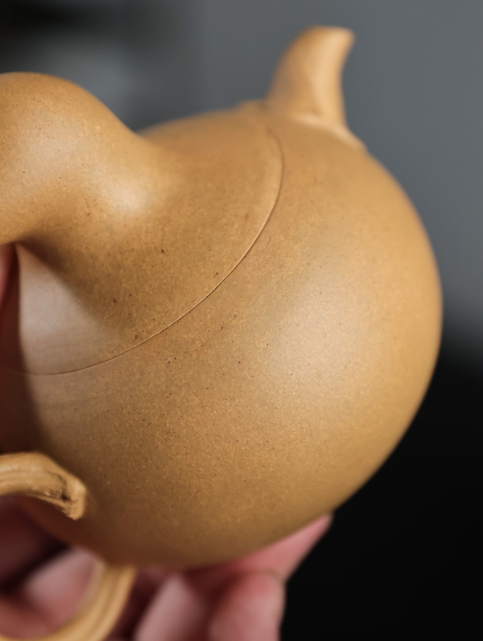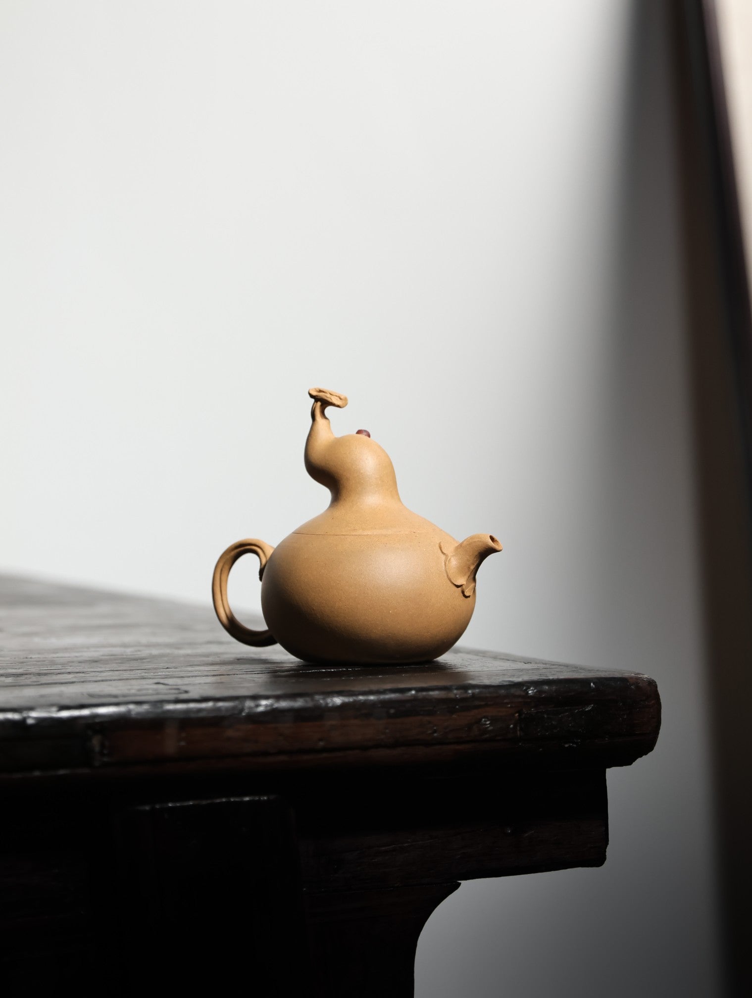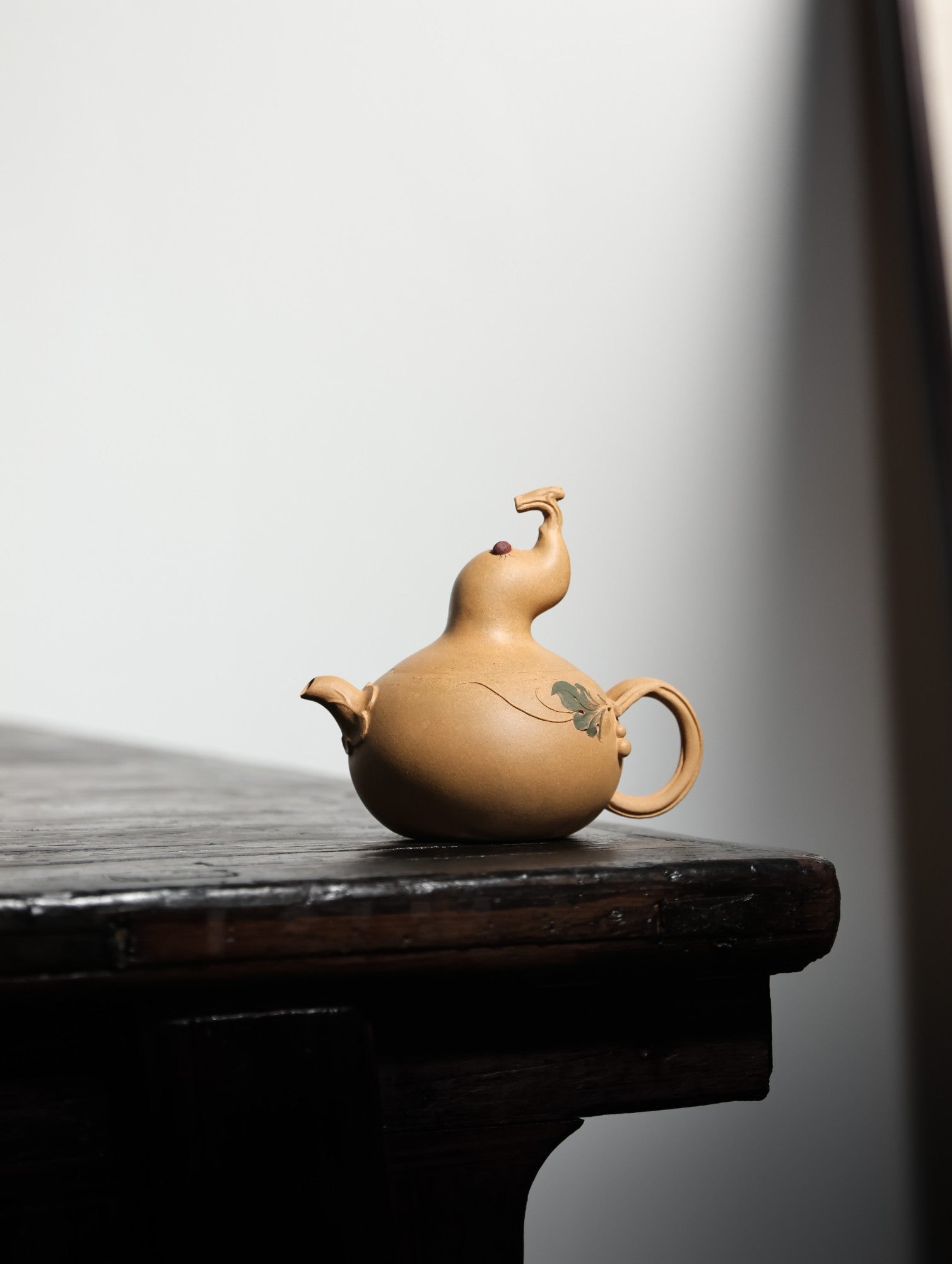 葫芦壶取形于葫芦瓜,取自大自然,用于山水间。葫芦谐音福禄,寓意美满,福禄满门,可谓寿而康。此壶形似天然歪脖子葫芦天然异形姿态,一只七星瓢虫趴在壶身上,钮做蒂状,壶腹浑圆饱满,灵俏可爱,自得天趣,整体浑然天成,形象逼真,精巧别致,整体苍老却不失神气。惟妙惟肖的束腰葫芦状壶身,挂果个小葫芦果,质朴之余飘逸灵动,平添几分活泼。壶盖为锁盖,嵌盖设计,与壶身融为一体,壶盖与壶身上下贯通。 自然又不失气势,刚挺又不失田园生机,是茶器更是艺术品,欢迎品鉴收藏。