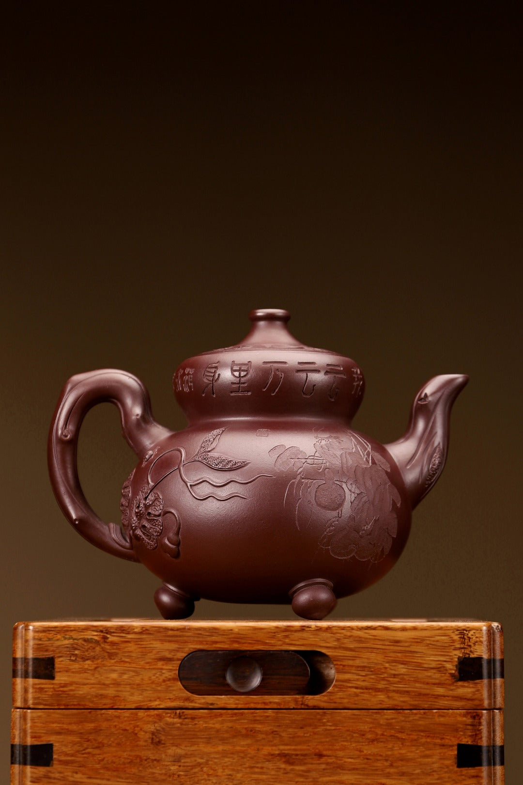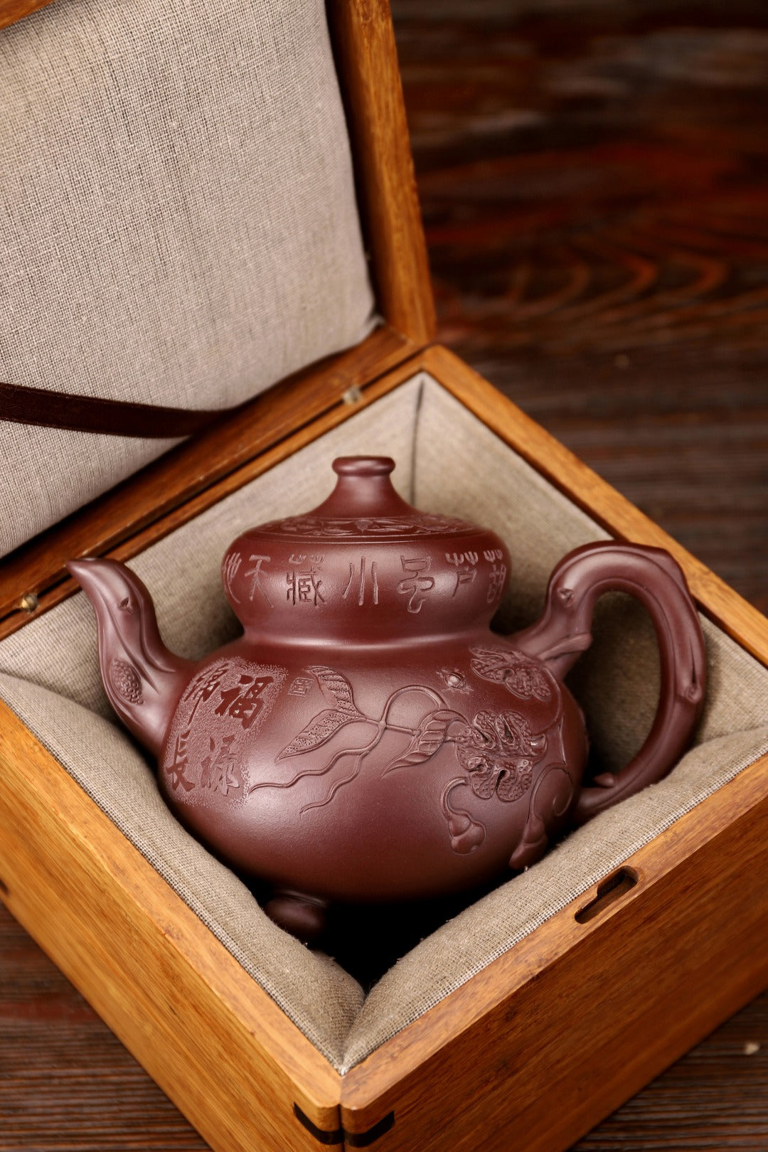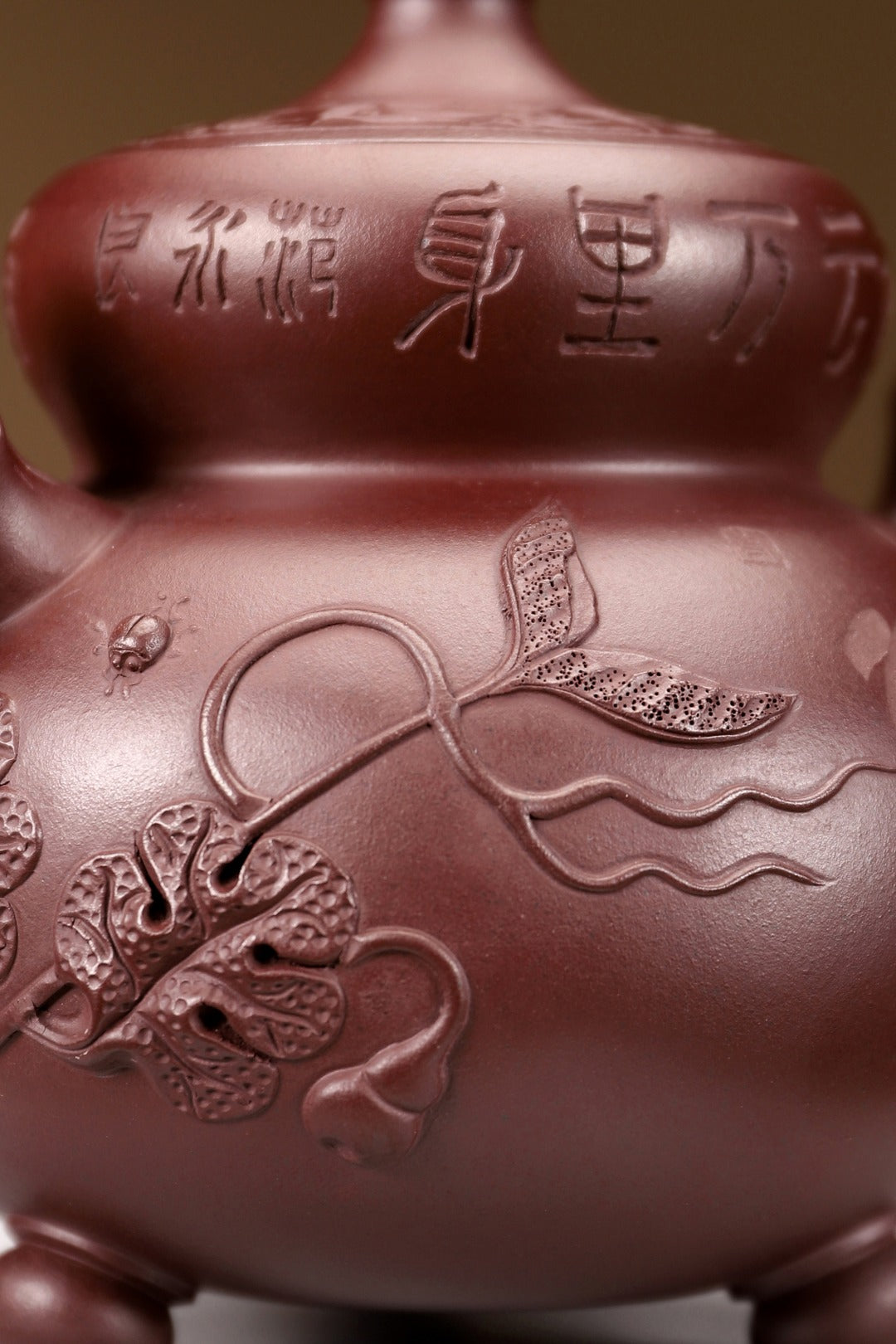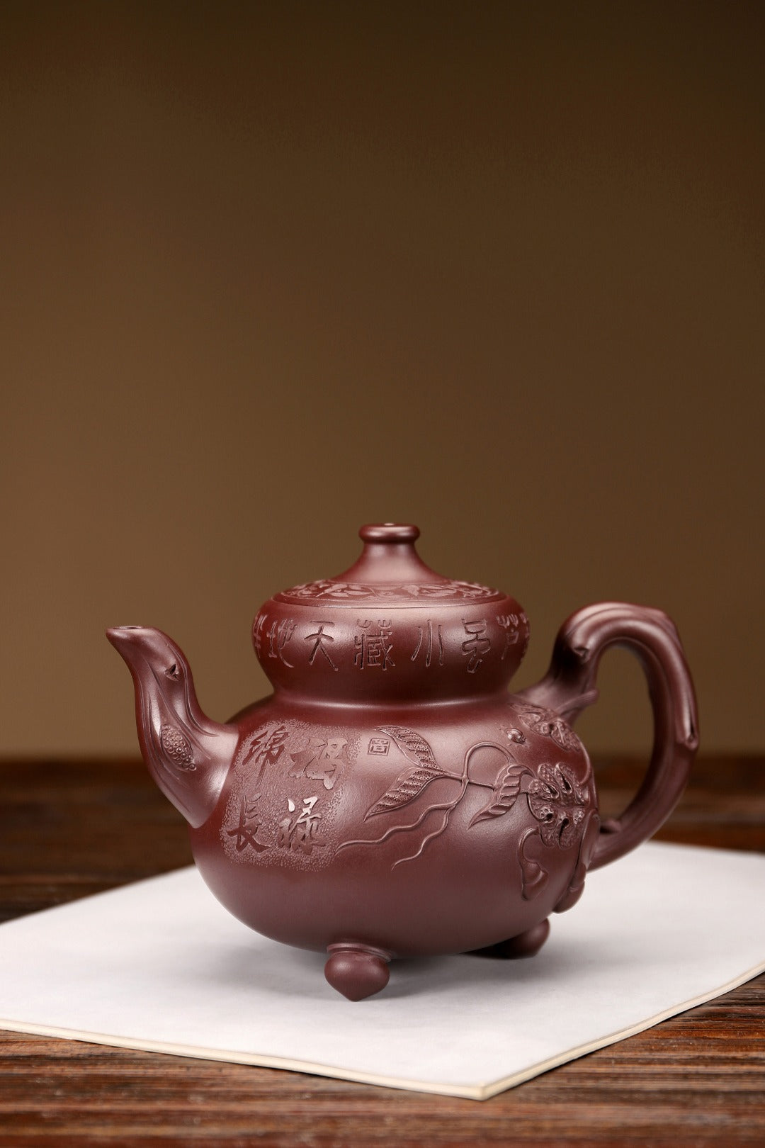 作品简介:此款福禄壶体造型呈葫芦状。壶流弯而微向上翘,环把里弯回收,盖顶葫芦钮。整器形制的线条以浑圆为主,十分流畅,静中有动,动中有静,灵妙天然。
