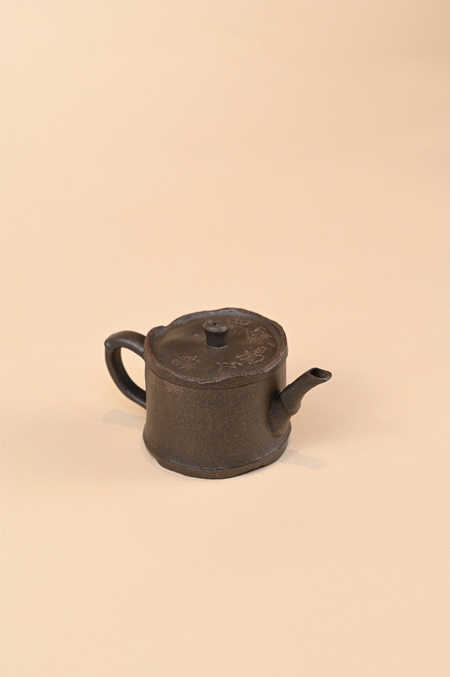 以竹入壶,上下一体,有骨有势,自然不做作,给人踏实之感,壶嘴、梁、盖钮亦取竹段,辅以逸趣诗句,生动自然,高雅清秀。