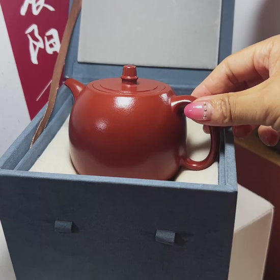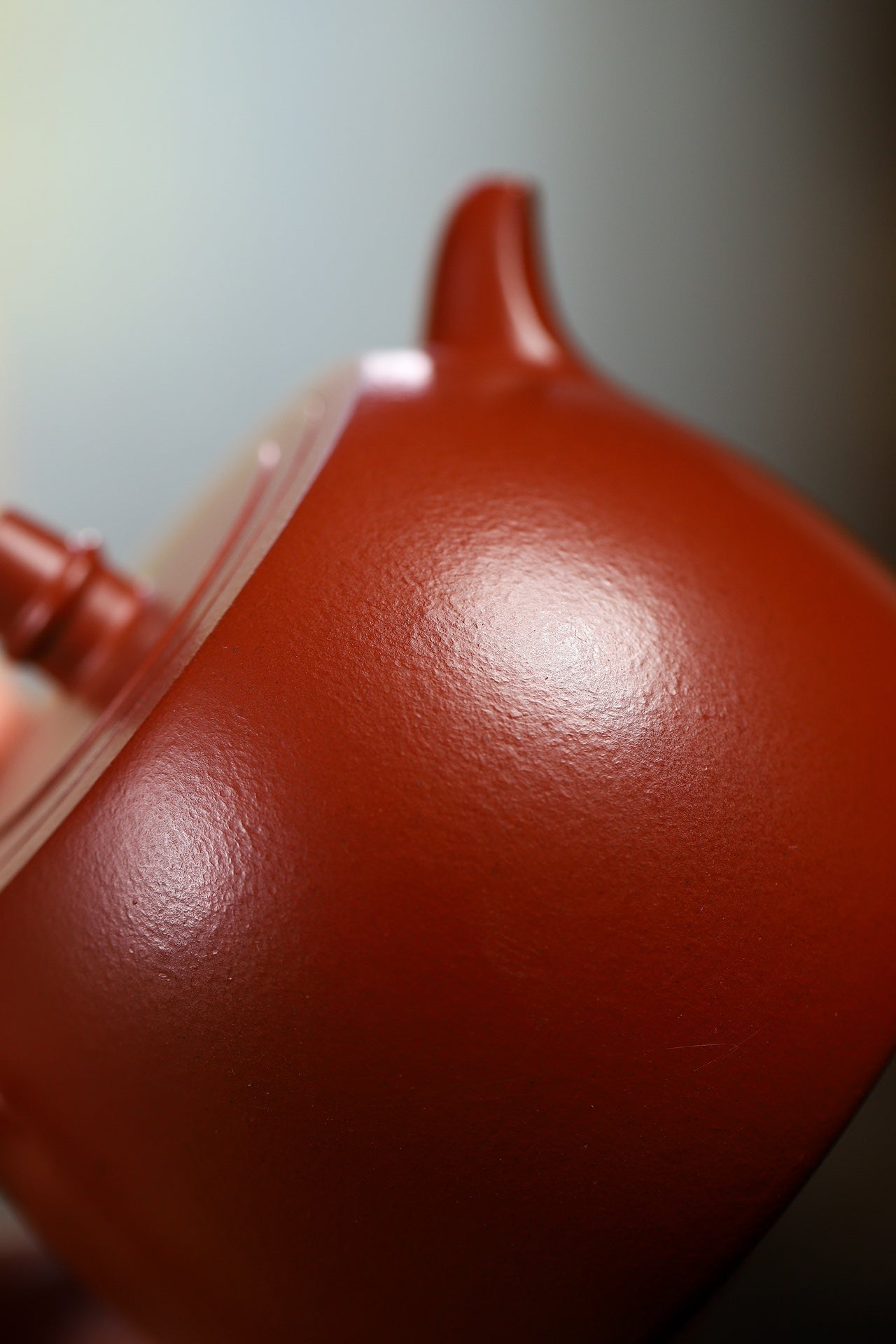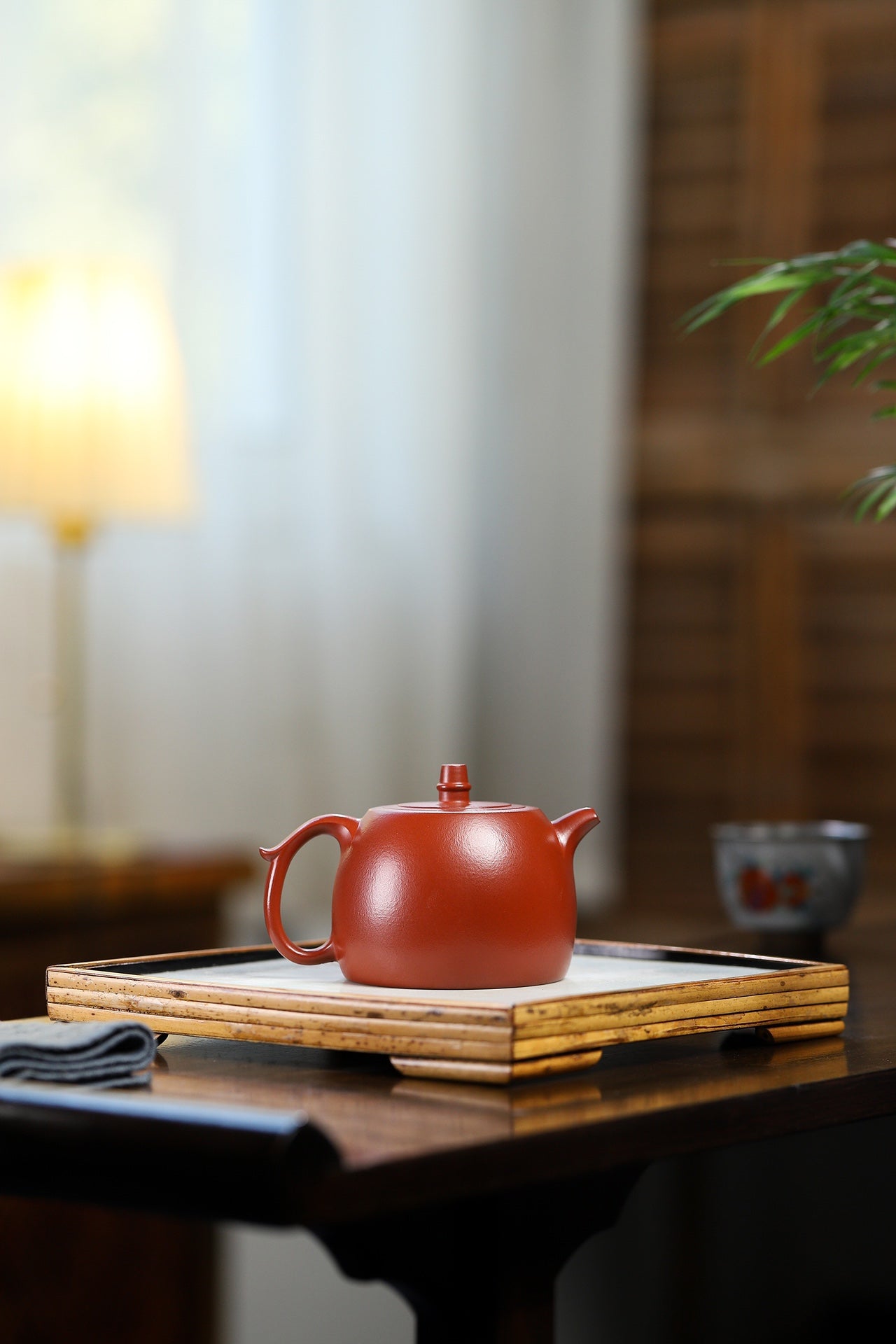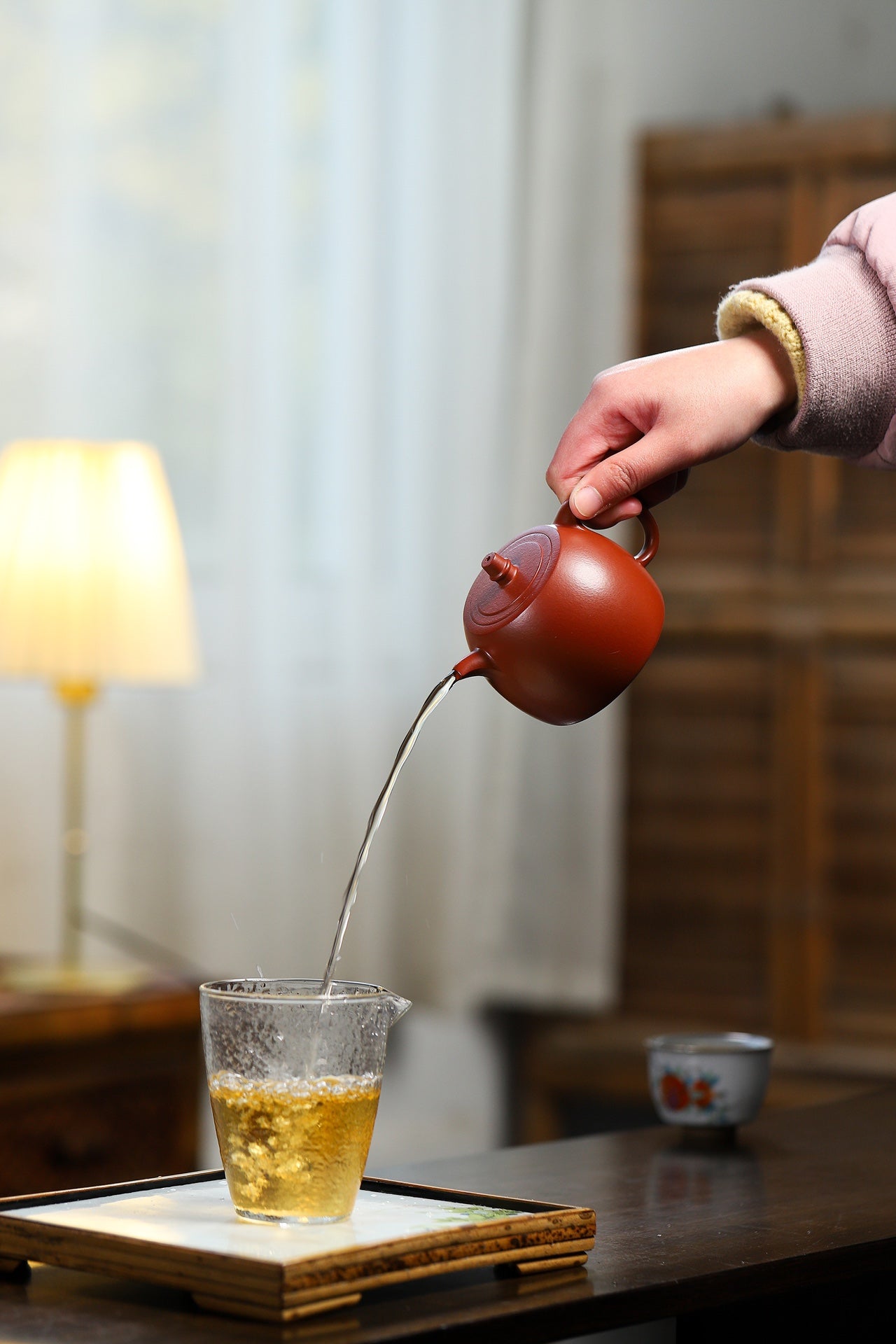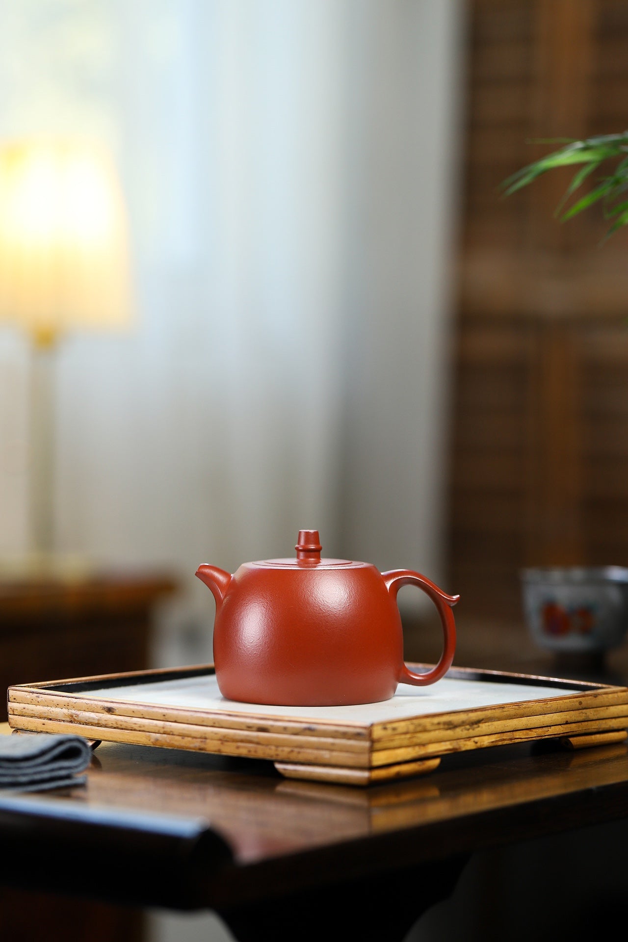 井栏是传统壶型,以其古朴沉稳深受人们喜爱,此壶采用原矿朱泥泥料,全手工制作,传统器型,做工极佳,这款井栏壶壶身是由弧线构成柱体,壶钮同样为柱体;管状流斜斜向上,略微呈水平状,环形壶把中心略为下沉,与壶嘴相呼应,构成悠扬的气势。整款壶器型简单,线条凝练,恰到好处,耐人寻味。