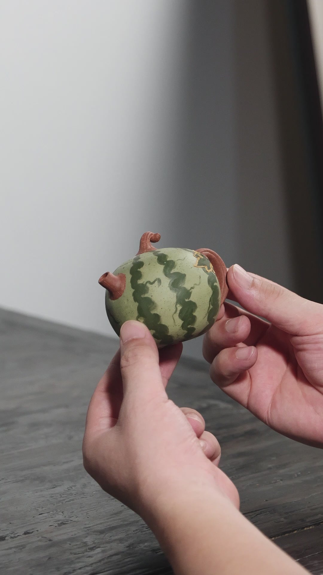 取自大自然,用于山水间。灵感源自于生活,以西瓜造型为壶体,外表是深绿和浅绿的相间花纹,色彩逼真,纹理清晰自然,妙趣横生,让人感觉清凉甘美之意。或多或少,人们心中都有一个田园梦。或大或小,每个夏天都要拥有一个西瓜。此壶壶嘴壶鈕壶把均以瓜藤造型,壶身贴叶,更加灵动,构思新颖,扑面而来一种夏天的感觉。掌心中的瓜田李下,一起来做个吃瓜群众吧!