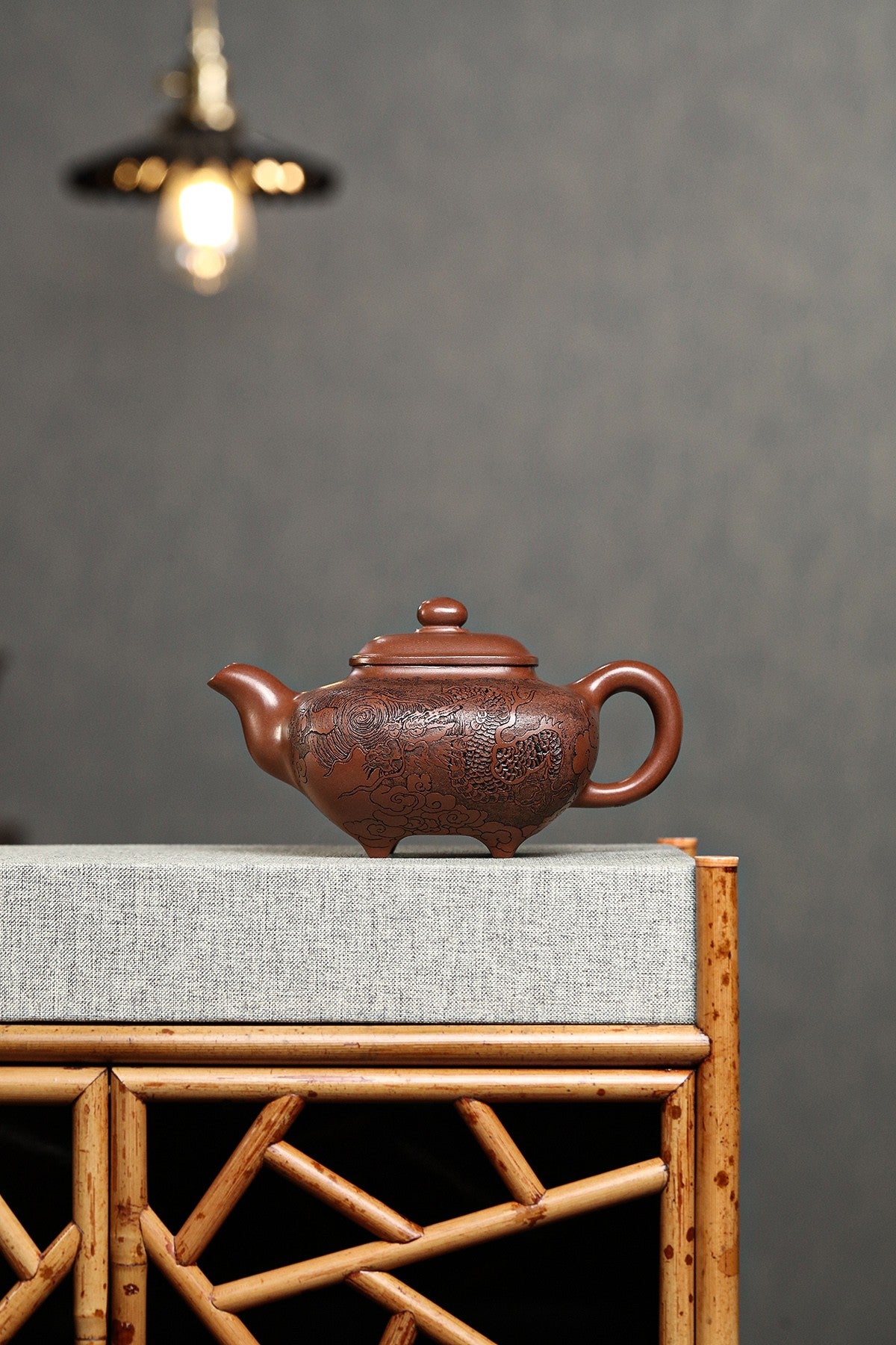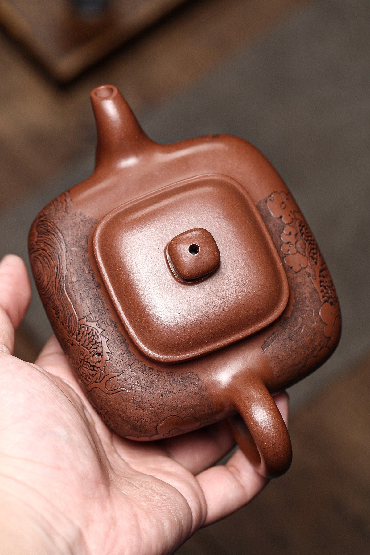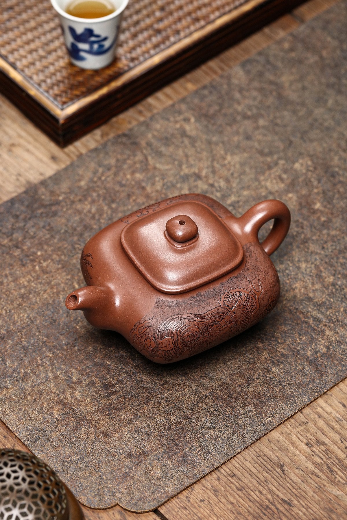 由知明老师精刻云中游龙,栩栩如生霸气十足!传炉壶的成型难度相当高,是紫砂器最具挑战性的器形之一。该壶器身以方器为基本形,方中有圆,比一般方器多了一份圆润之美。壶嘴的造型难度亦高,方中带圆,圆中寓方,三弯流式,在处理上倍增挑战。盖呈方形圆角,唇边厚实,盖面平弧微穹,中心钮滴似如算珠,做到了传炉中的经典气韵···