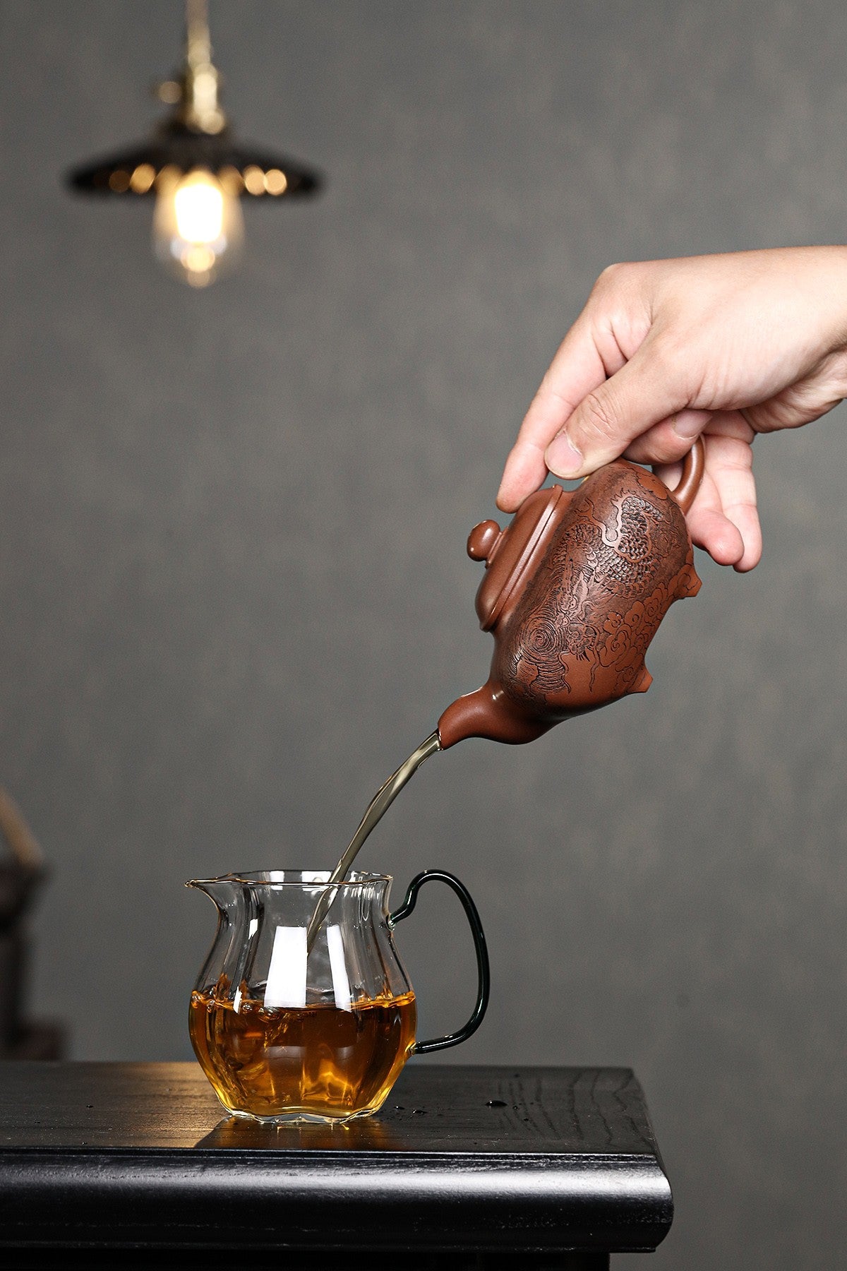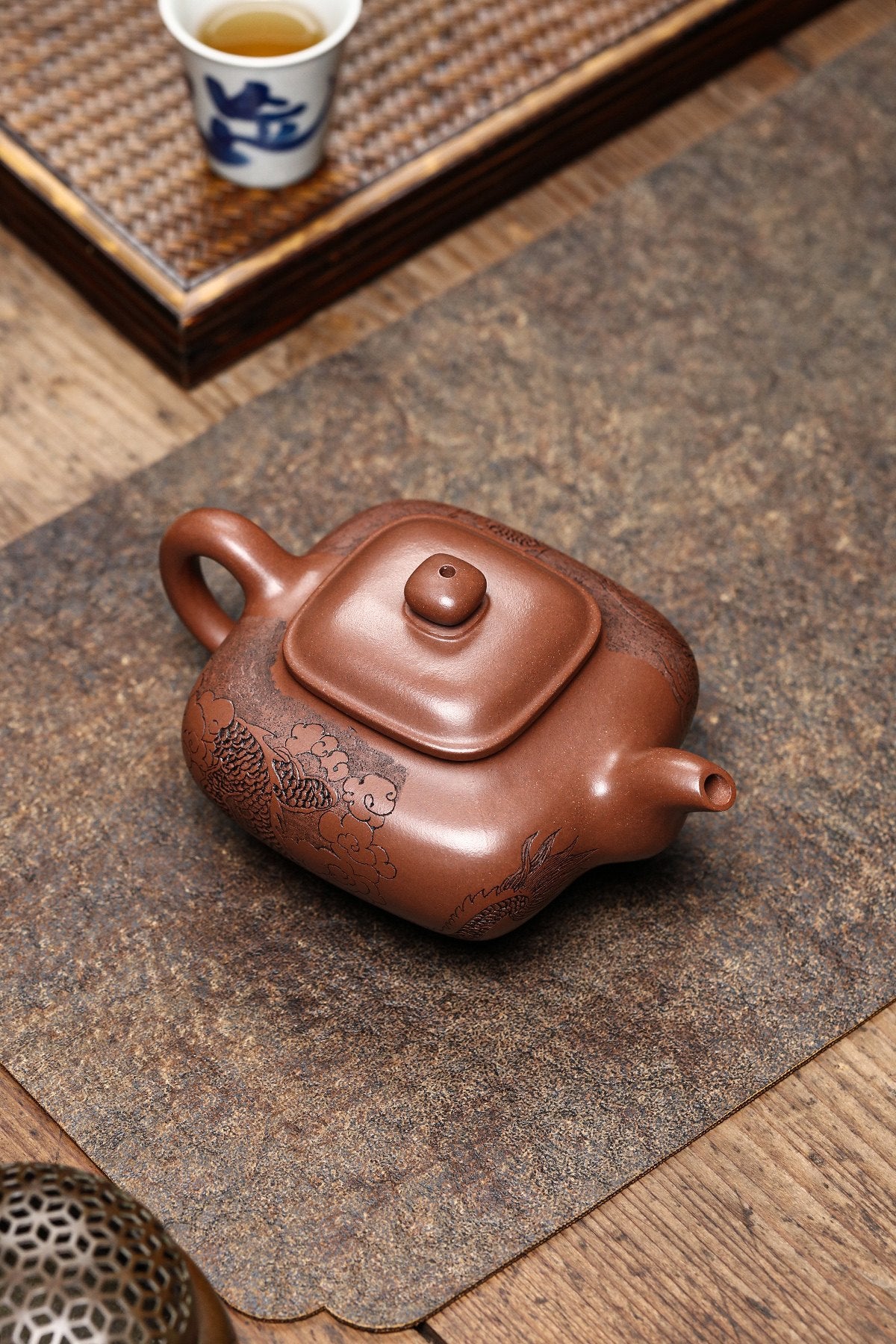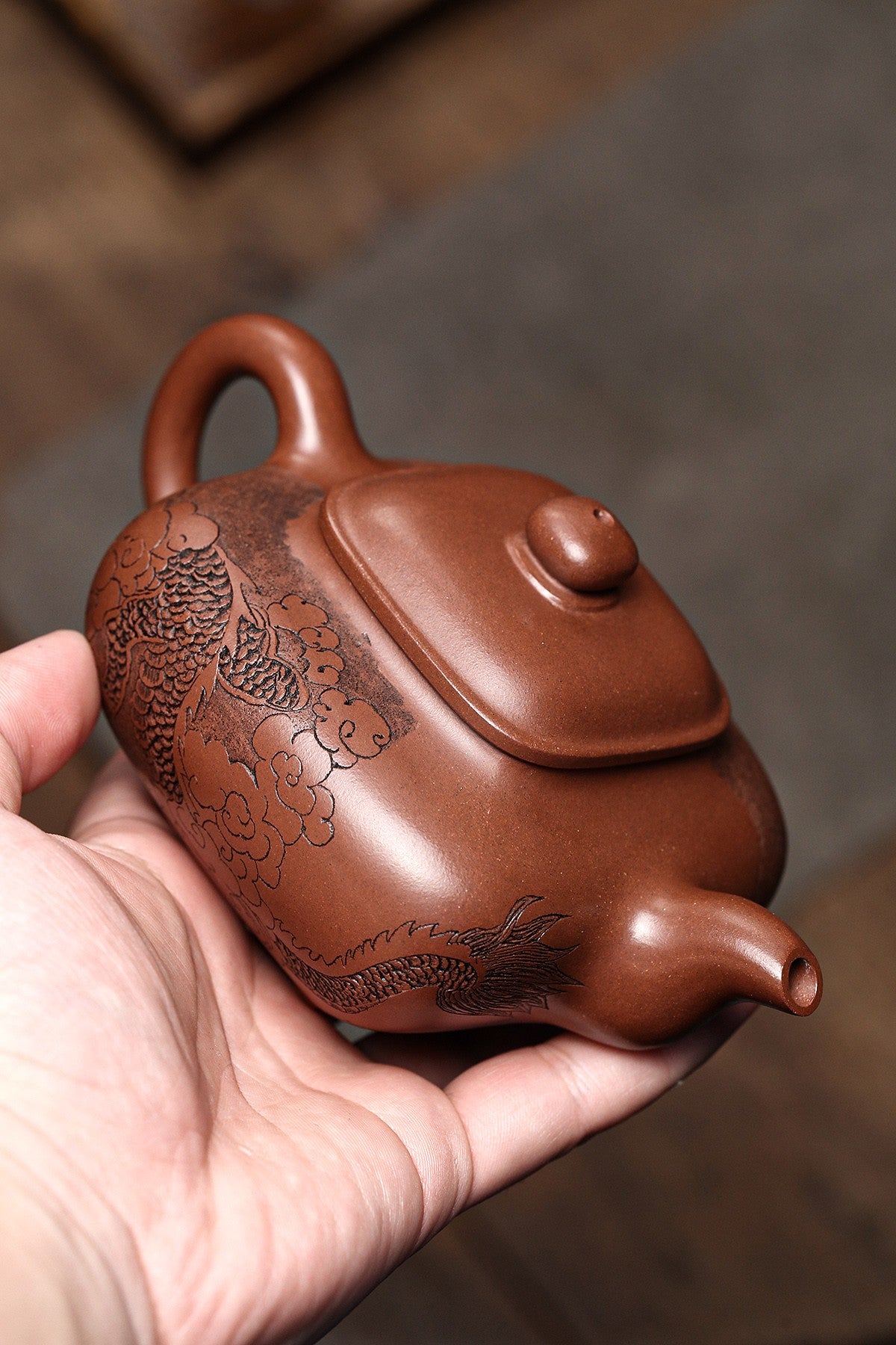 由知明老师精刻云中游龙,栩栩如生霸气十足!传炉壶的成型难度相当高,是紫砂器最具挑战性的器形之一。该壶器身以方器为基本形,方中有圆,比一般方器多了一份圆润之美。壶嘴的造型难度亦高,方中带圆,圆中寓方,三弯流式,在处理上倍增挑战。盖呈方形圆角,唇边厚实,盖面平弧微穹,中心钮滴似如算珠,做到了传炉中的经典气韵···