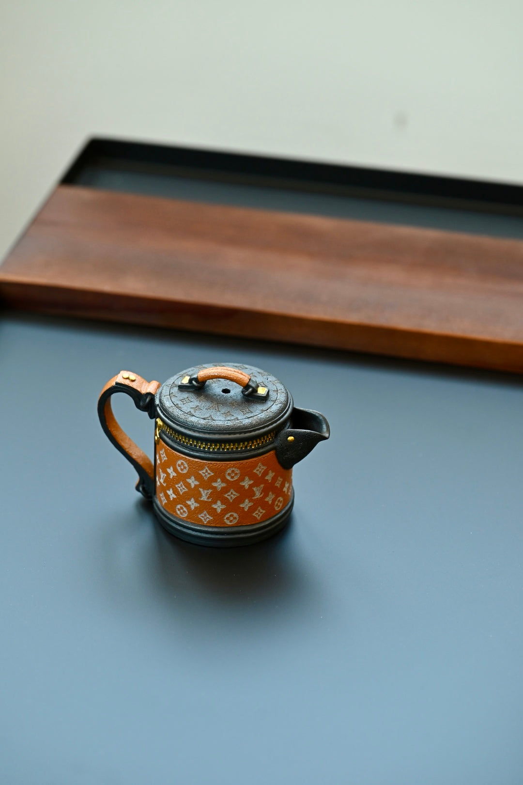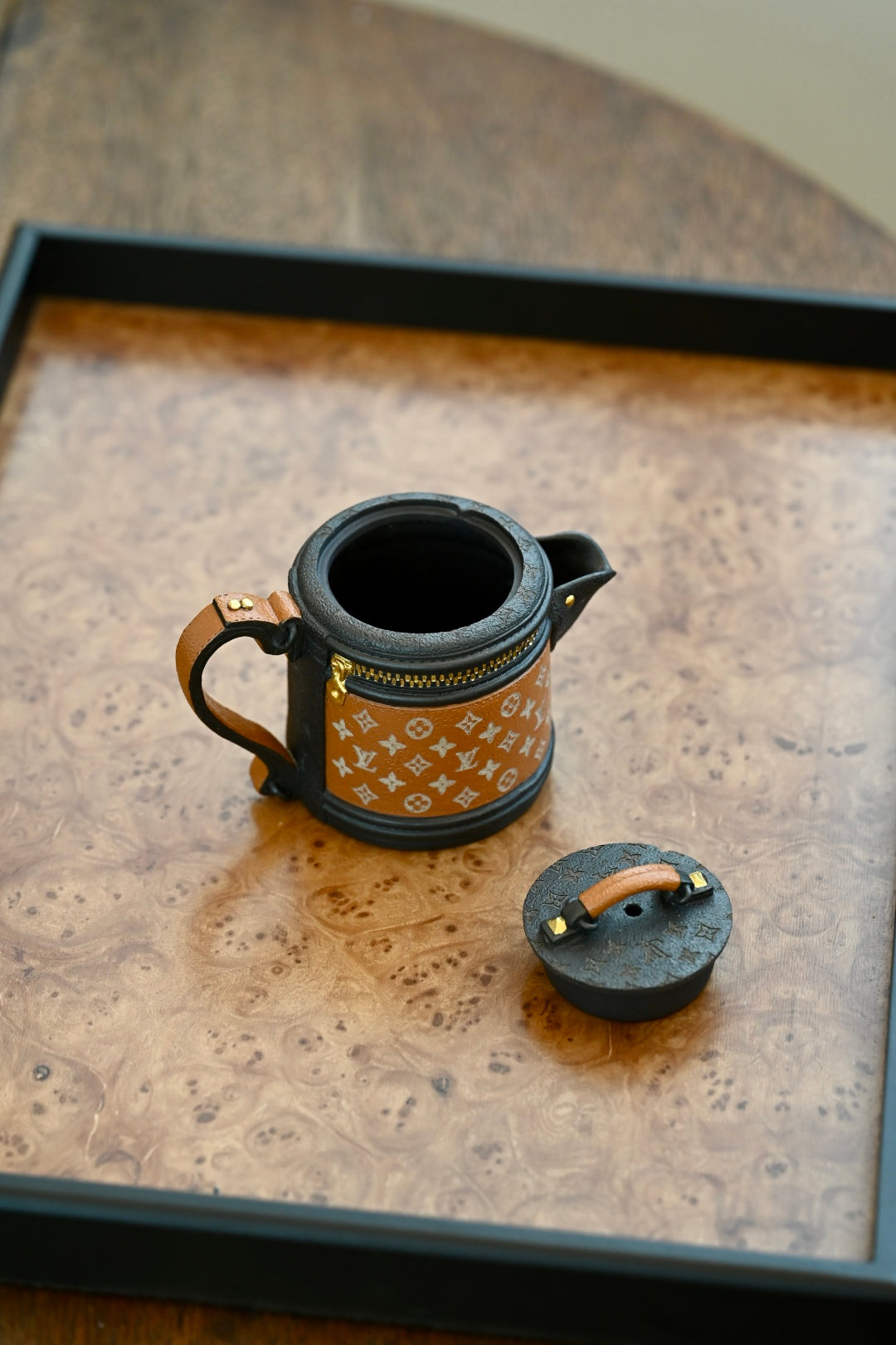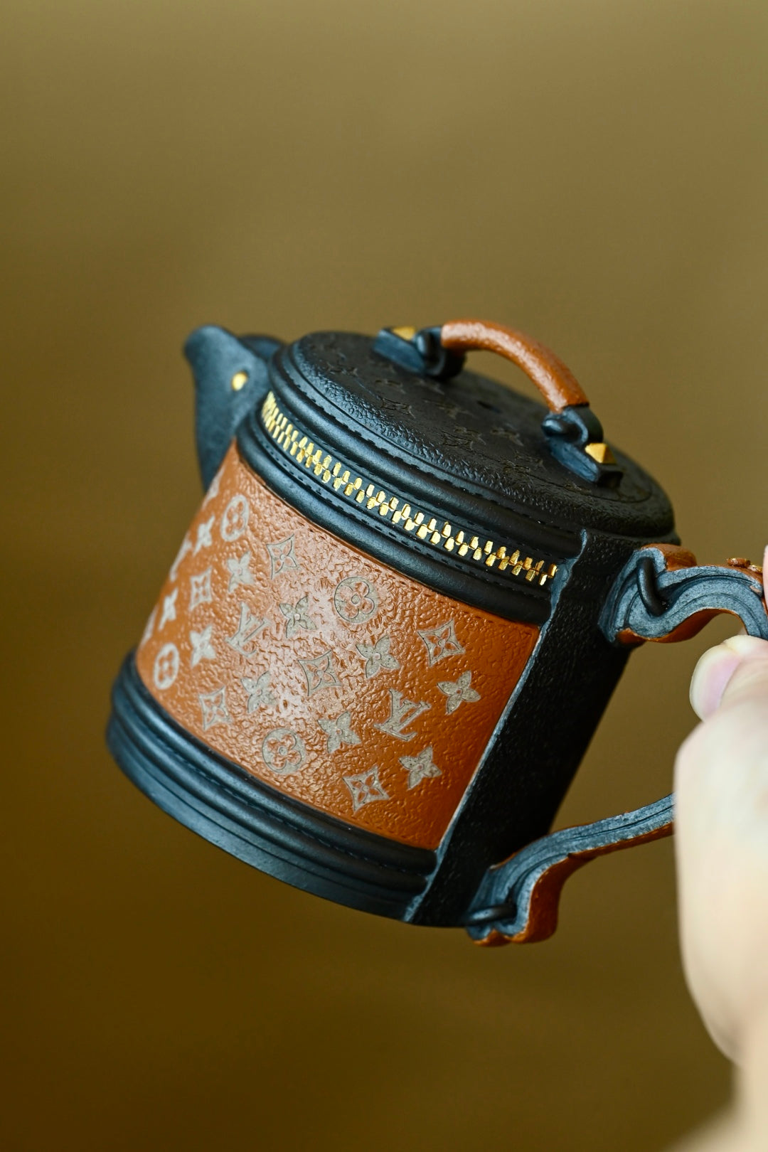 紫砂之美,设计为上,将现实中的LV发财桶系列包包融入紫砂创作中,圆桶造型,经典老花帆布加上黑色牛皮的拼色设计,再搭配五金件,融合了复古与摩登感,非常的有创意,设计感十足。