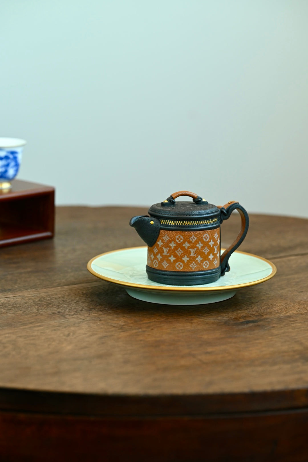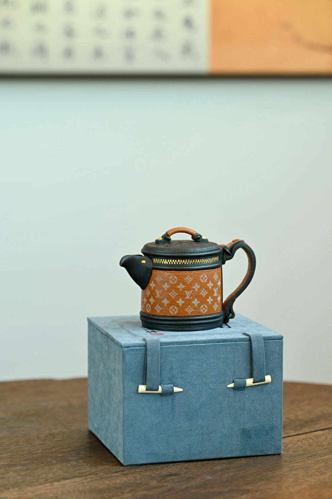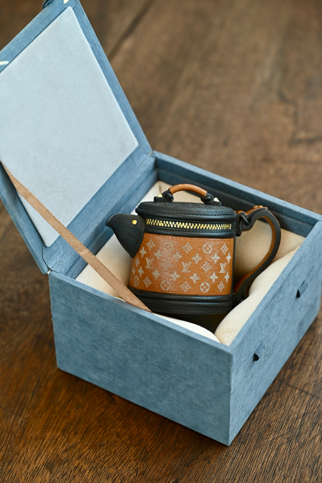 紫砂之美,设计为上,将现实中的LV发财桶系列包包融入紫砂创作中,圆桶造型,经典老花帆布加上黑色牛皮的拼色设计,再搭配五金件,融合了复古与摩登感,非常的有创意,设计感十足。