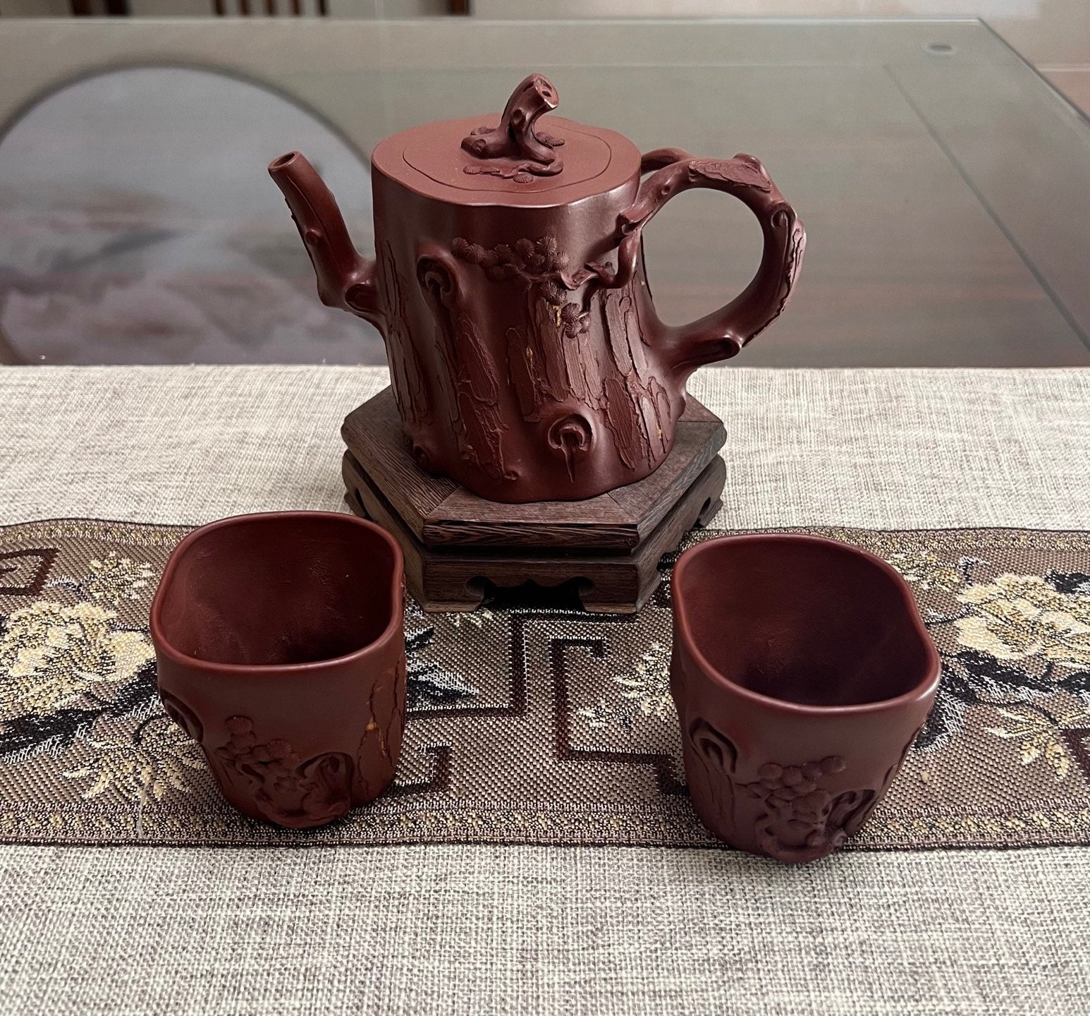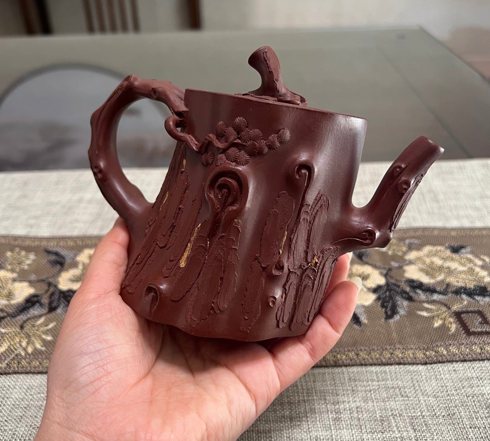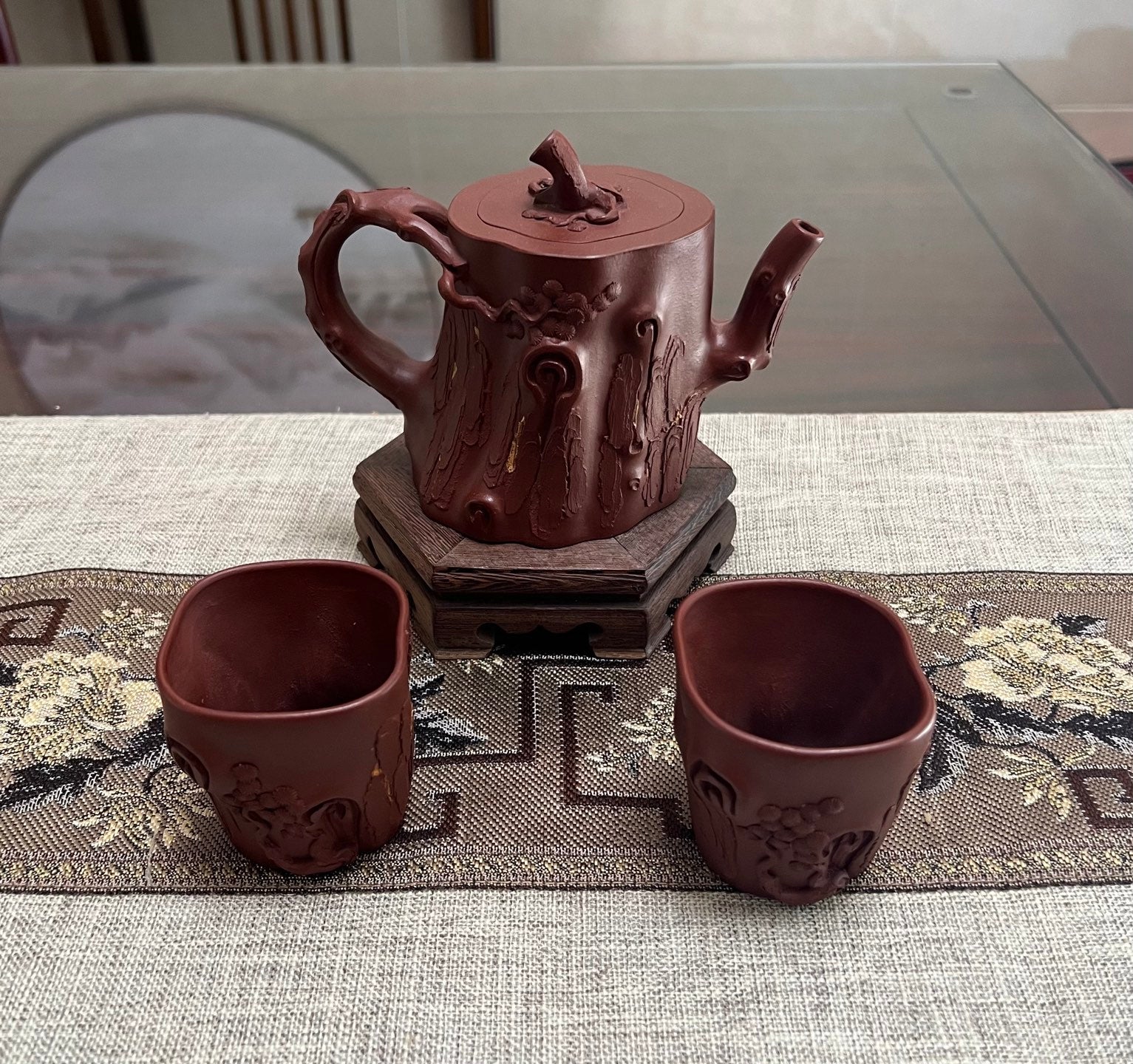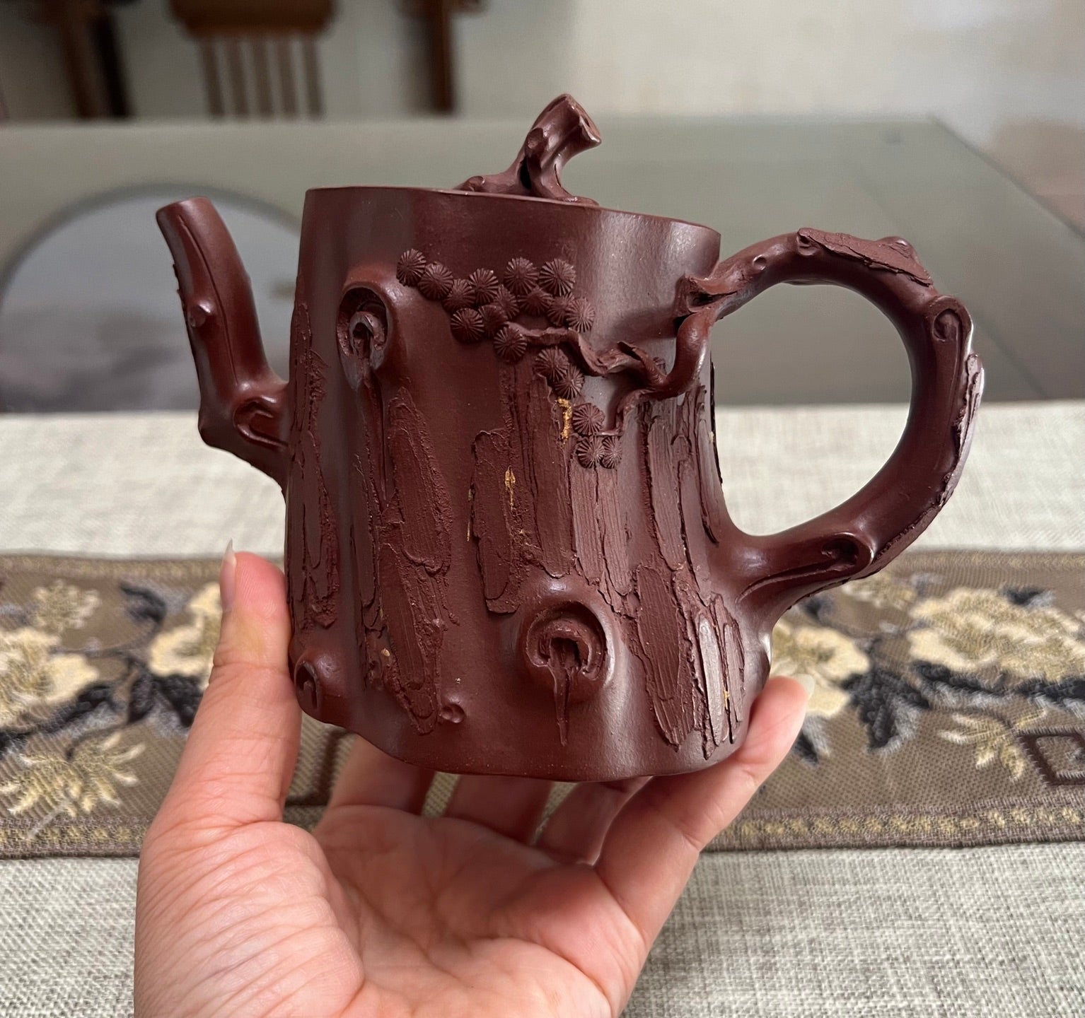 这套松桩仿生作品,造型精致,壶身,流,把,盖皆做松树枝节,平口。整件松段壶泥塑工艺精美,层层迭迭,将古松苍老之外皮塑造的分外相似。壶钮更是巧取松节一段,匍匐贴合于盖上,极其逼真。整件作品用工精致,配以两只品茗杯,值得收藏!!