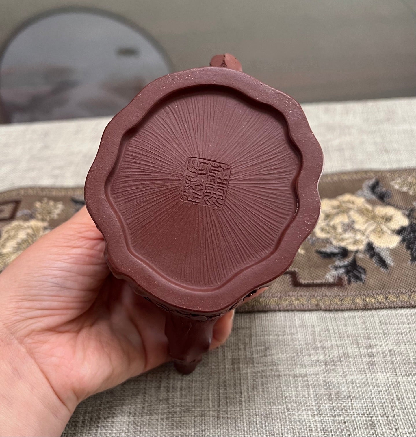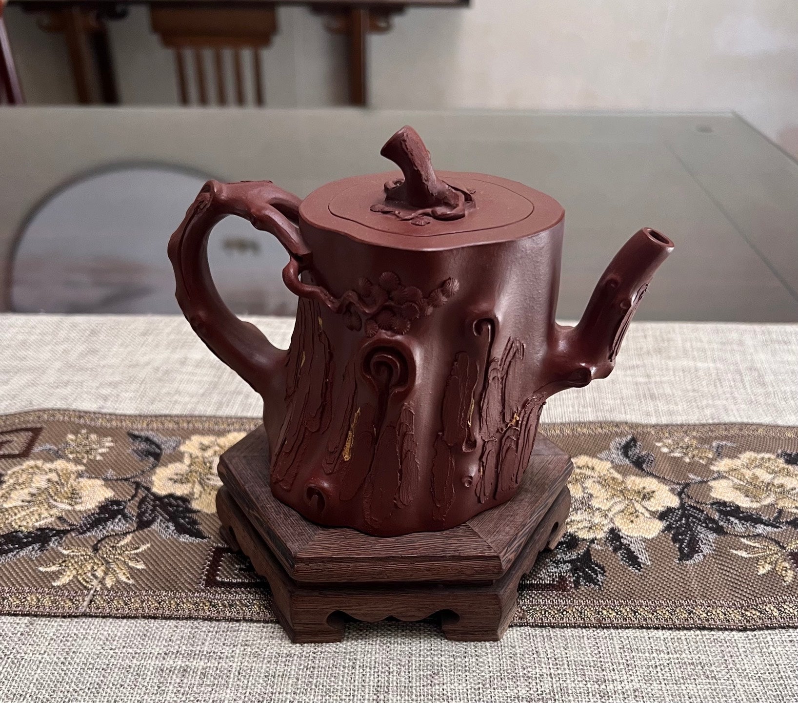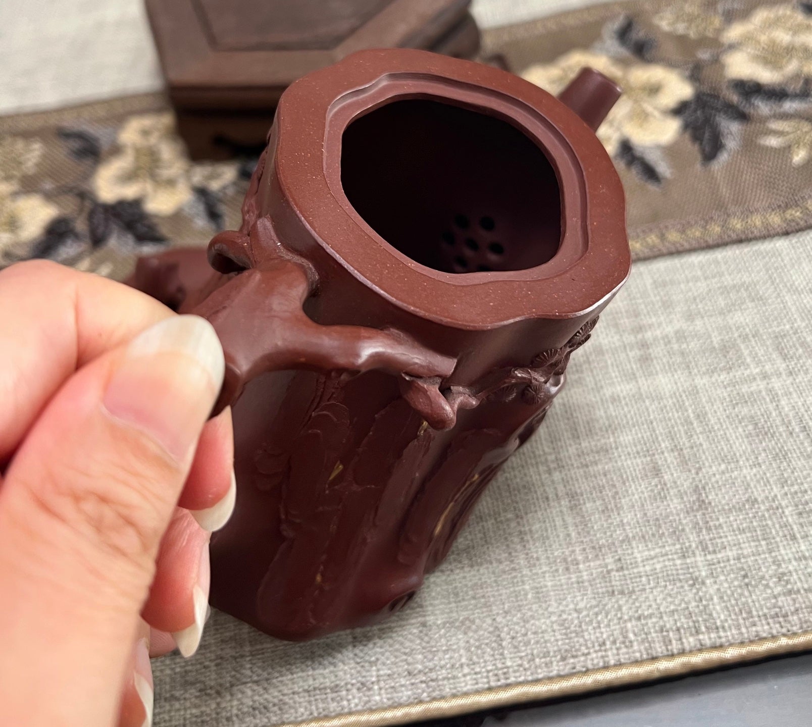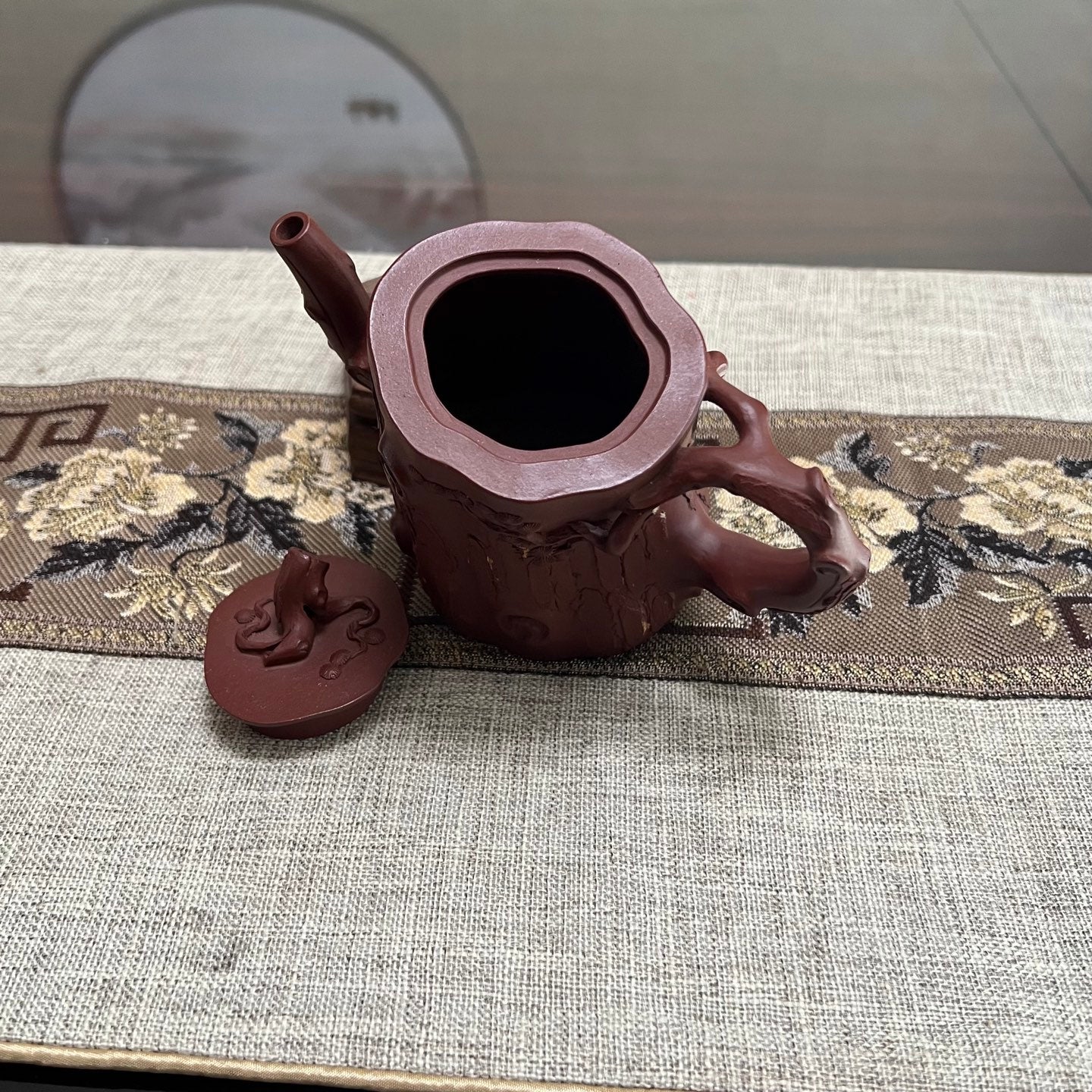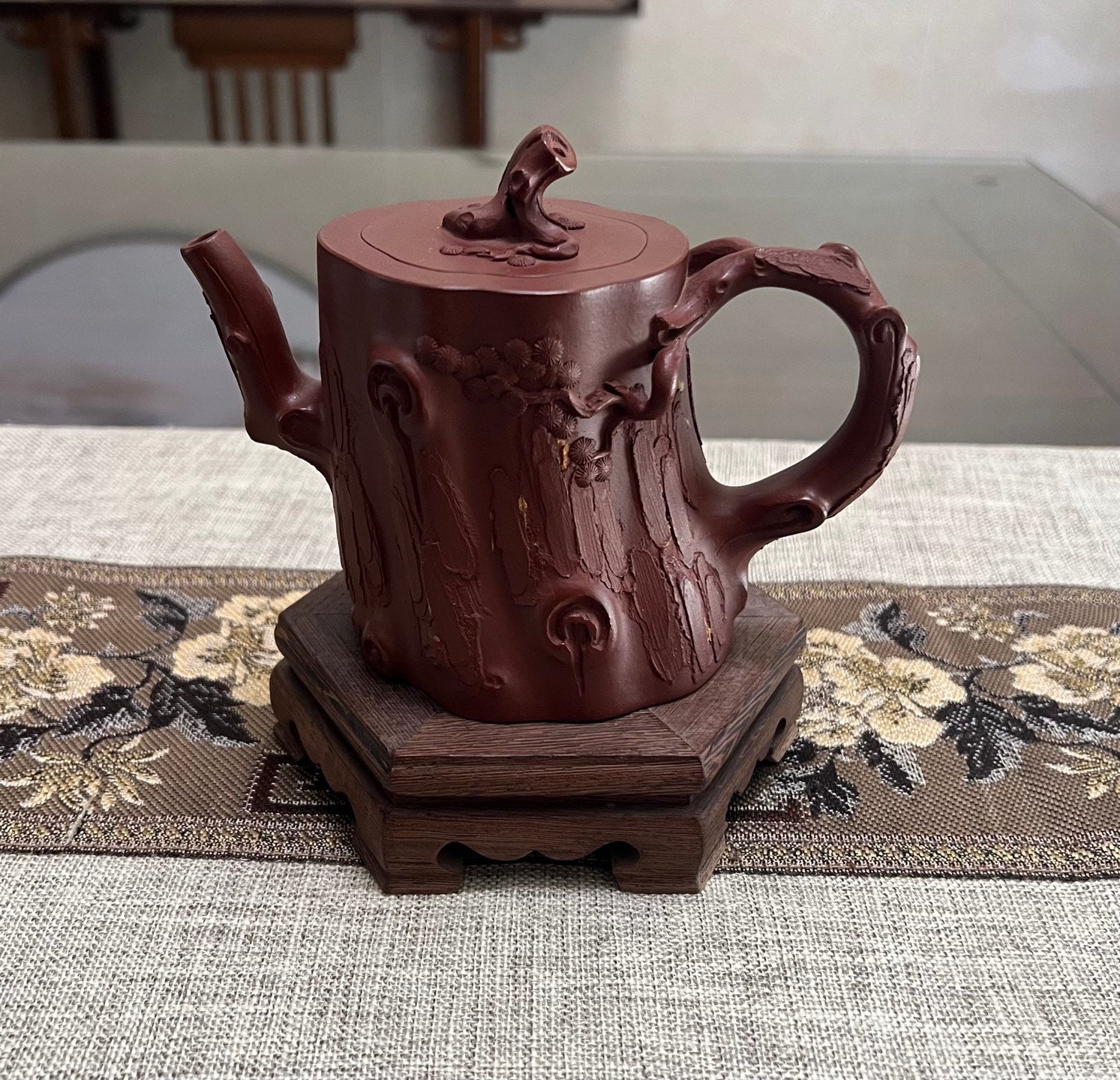 这套松桩仿生作品,造型精致,壶身,流,把,盖皆做松树枝节,平口。整件松段壶泥塑工艺精美,层层迭迭,将古松苍老之外皮塑造的分外相似。壶钮更是巧取松节一段,匍匐贴合于盖上,极其逼真。整件作品用工精致,配以两只品茗杯,值得收藏!!