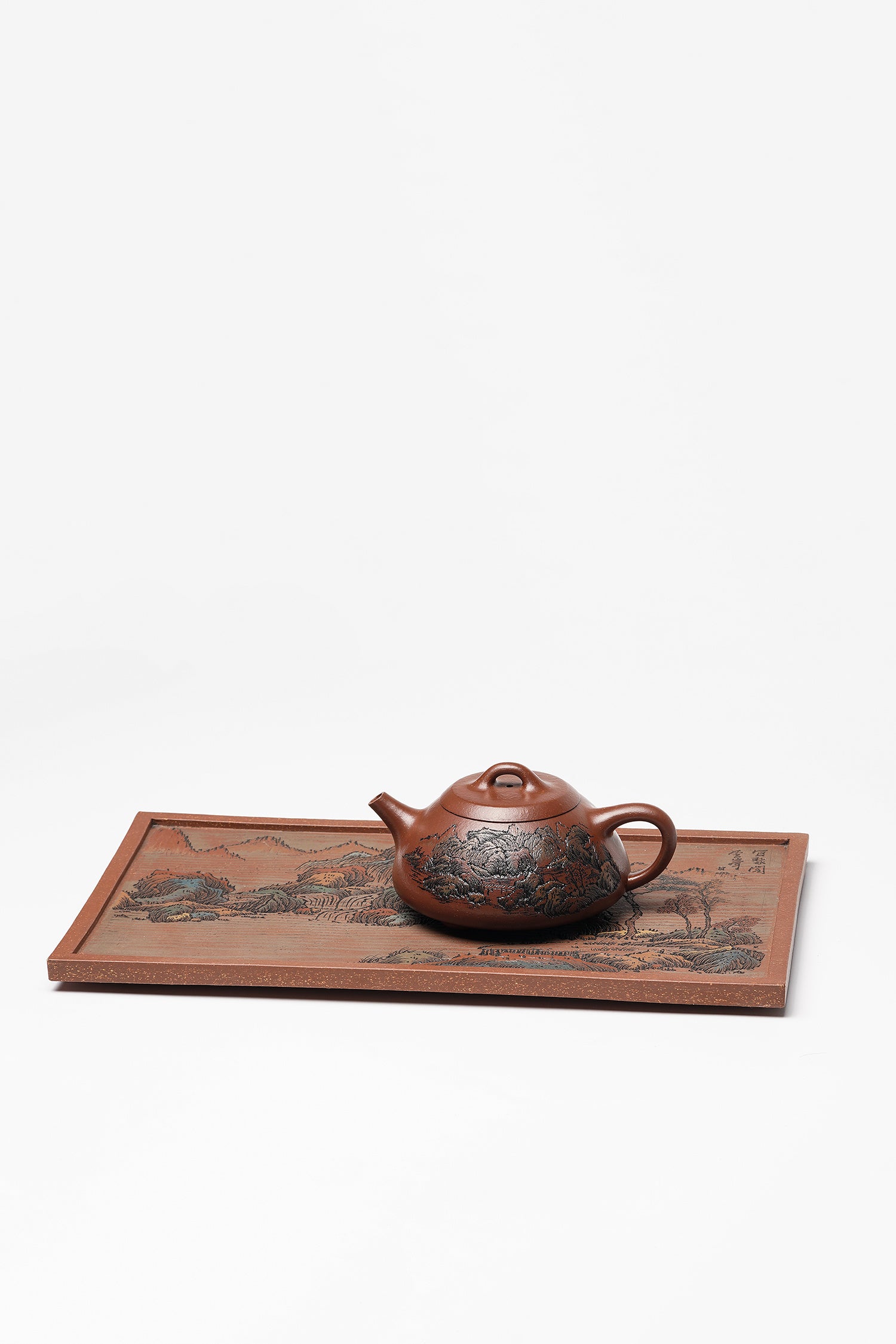 先以刀为笔,在紫砂坯体上层层刻出山峦叠嶂、水波流转的肌理,再粉紫砂矿物料,经高温窑火固色,最终呈现青绿山水和秋天的浓艳层次。每一道刻痕都需精准控制深浅和布局,每一抹色彩都要与泥料肌理浑然相融,稍有不慎便前功尽弃,是紫砂彩刻工艺的巅峰挑战。
