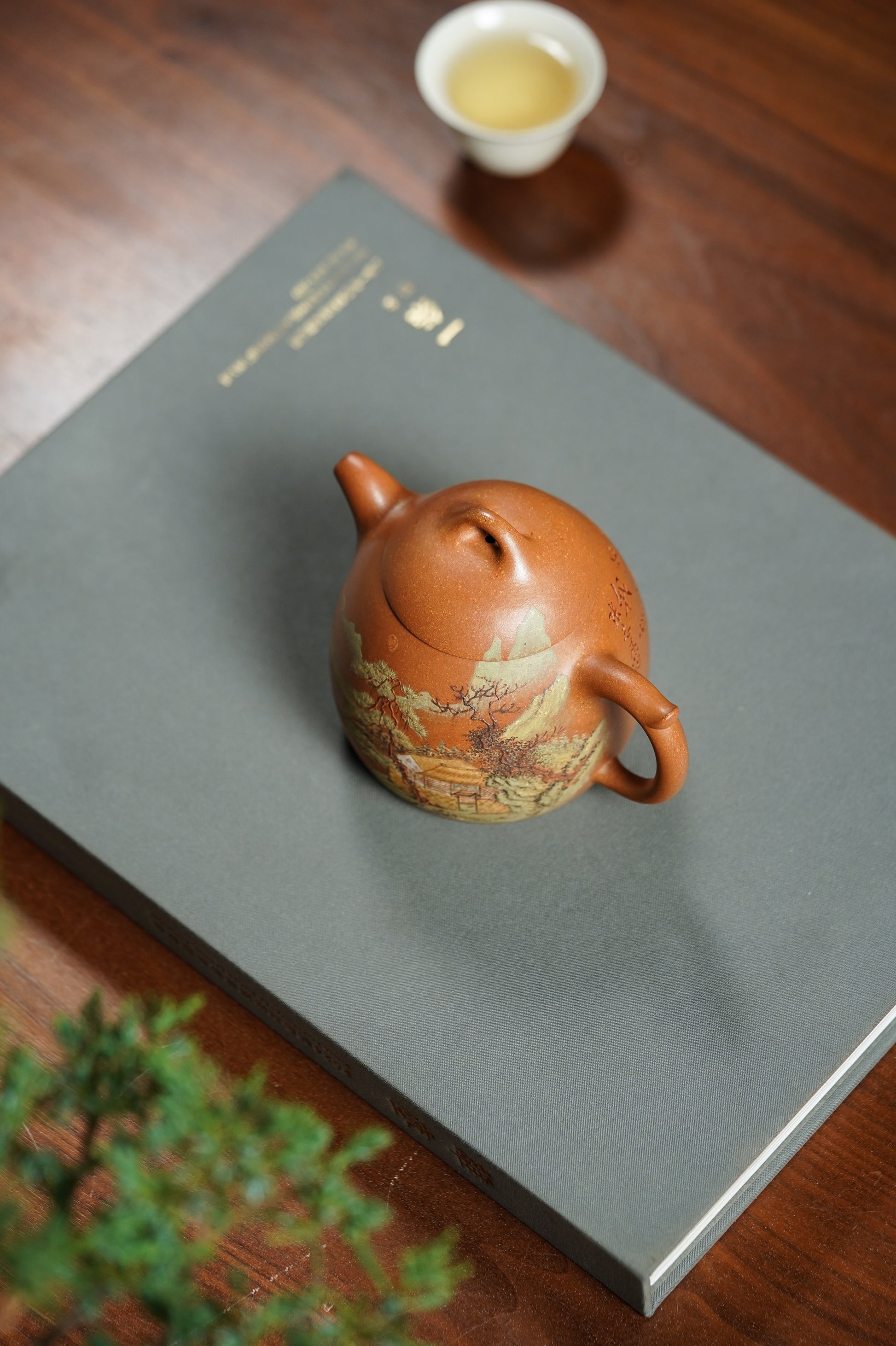 壶身张志杰匠心泥绘山水雅居图:苍松挺拔、茅舍隐于青山绿水间,远山含黛、近树含情,一派“松风煮茶、山居归隐”的清雅意境。