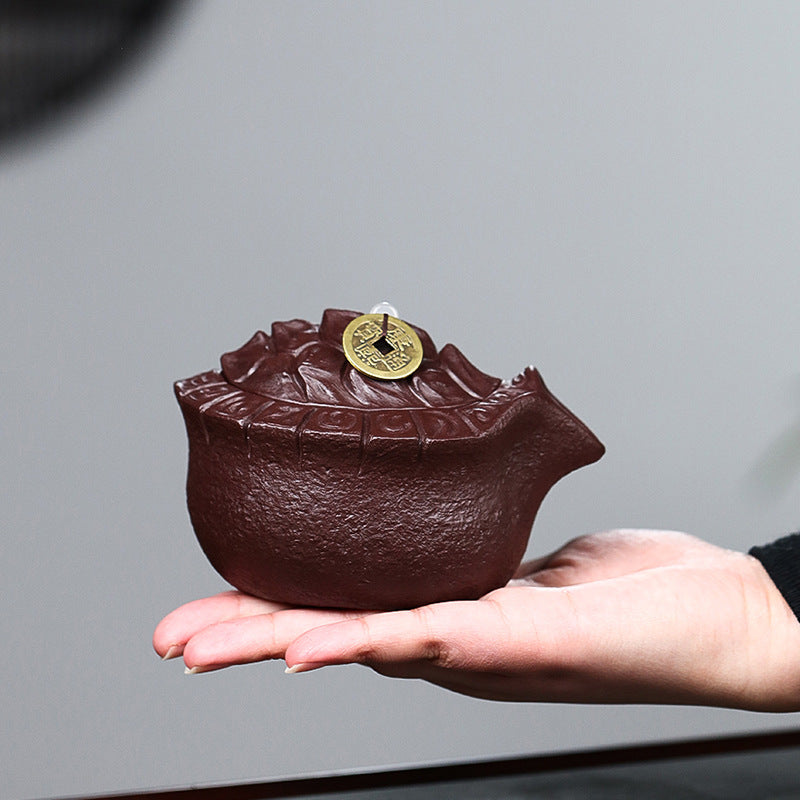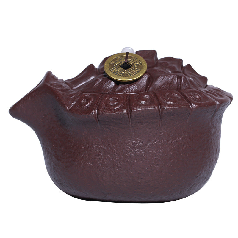 壶身呈龟甲状,线条清晰流畅,出水利落,杯身端拿方便,压盖设计,镂空壶底,与主题相应和,寓意繁荣昌盛,富甲一方。