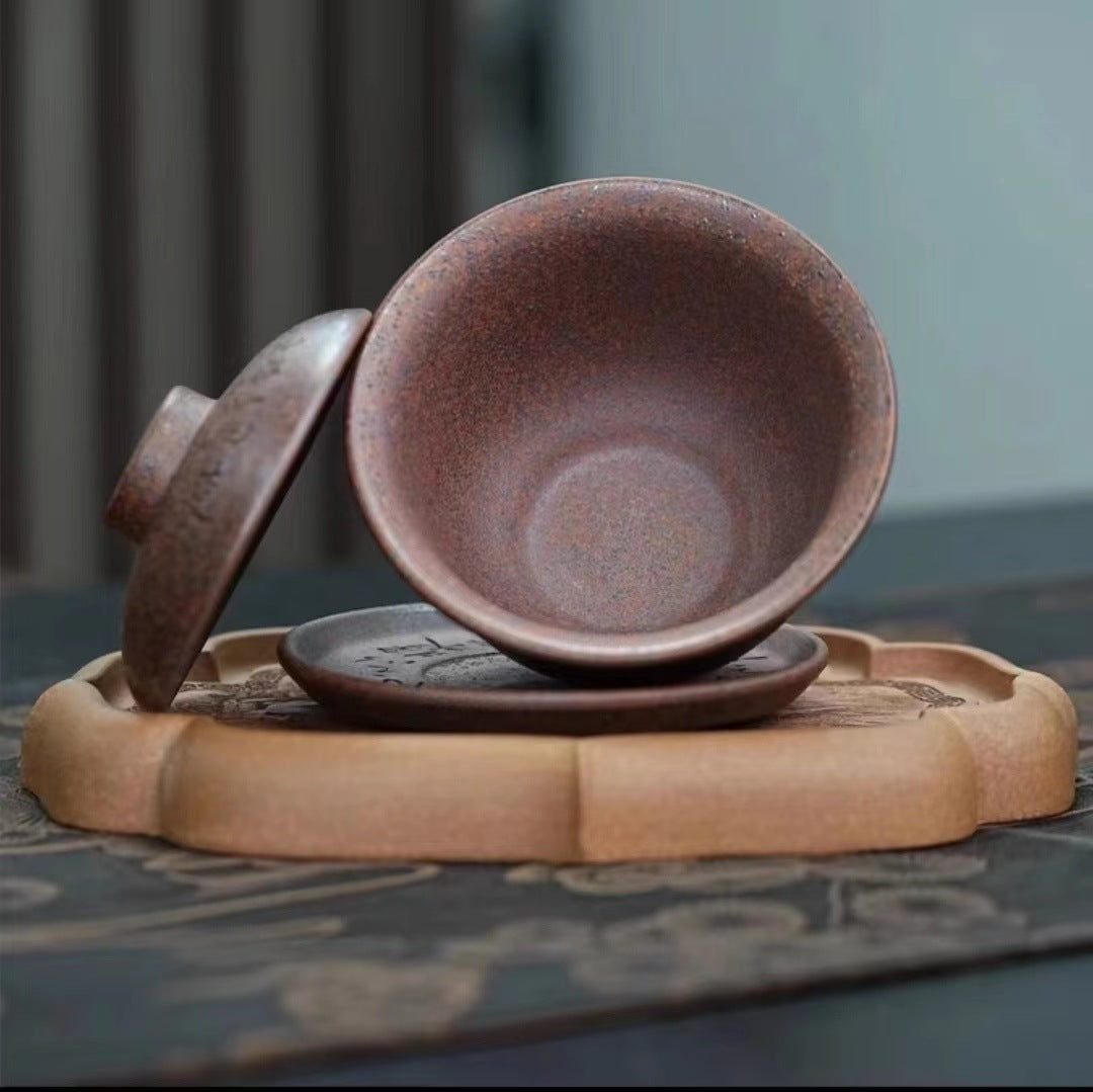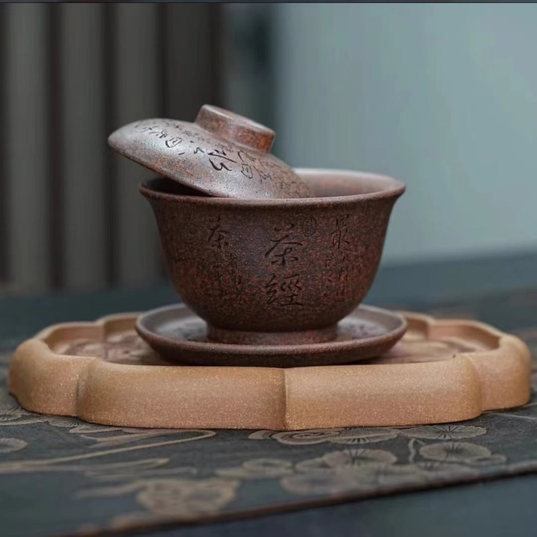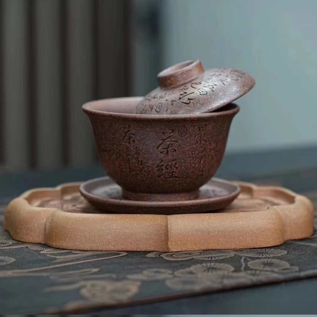 紫砂朱永良盖碗宜兴原矿龙骨金砂柴烧刻绘茶经盖碗主人杯150ml