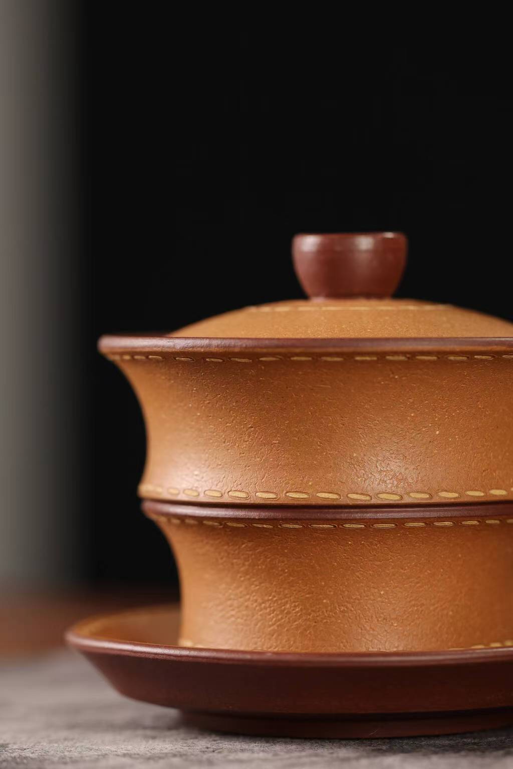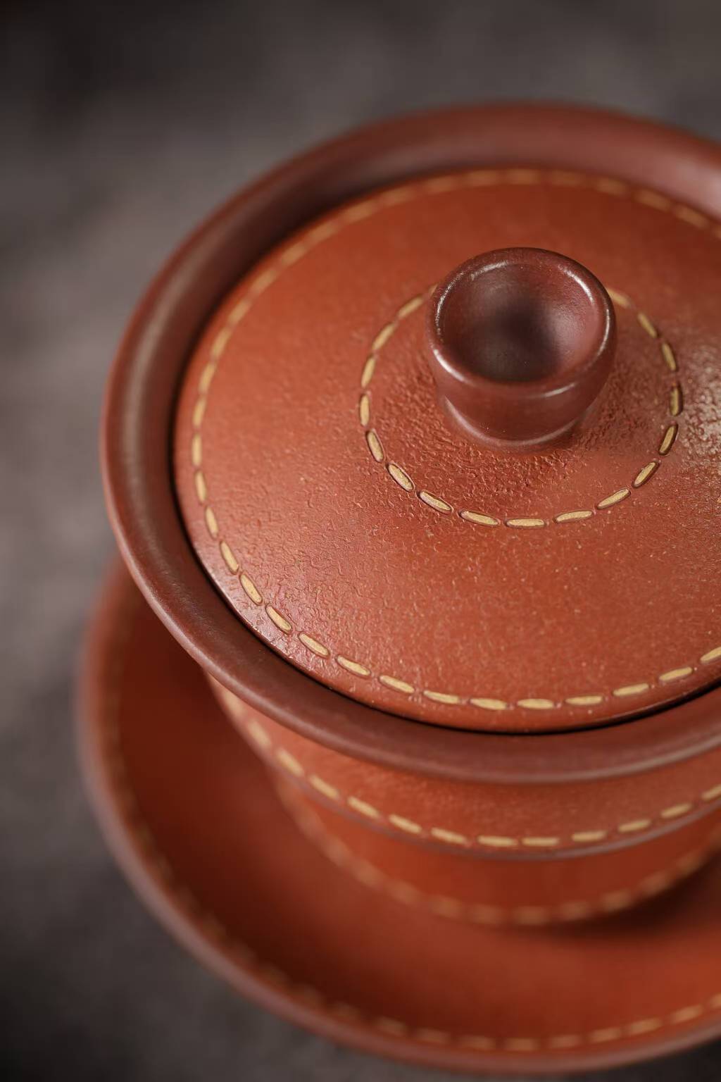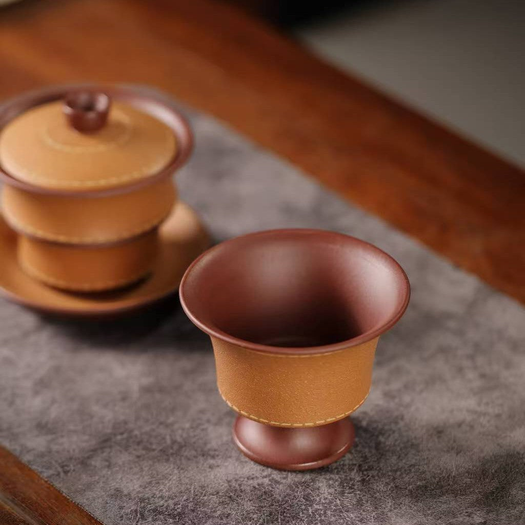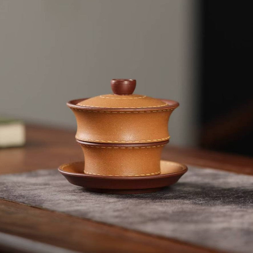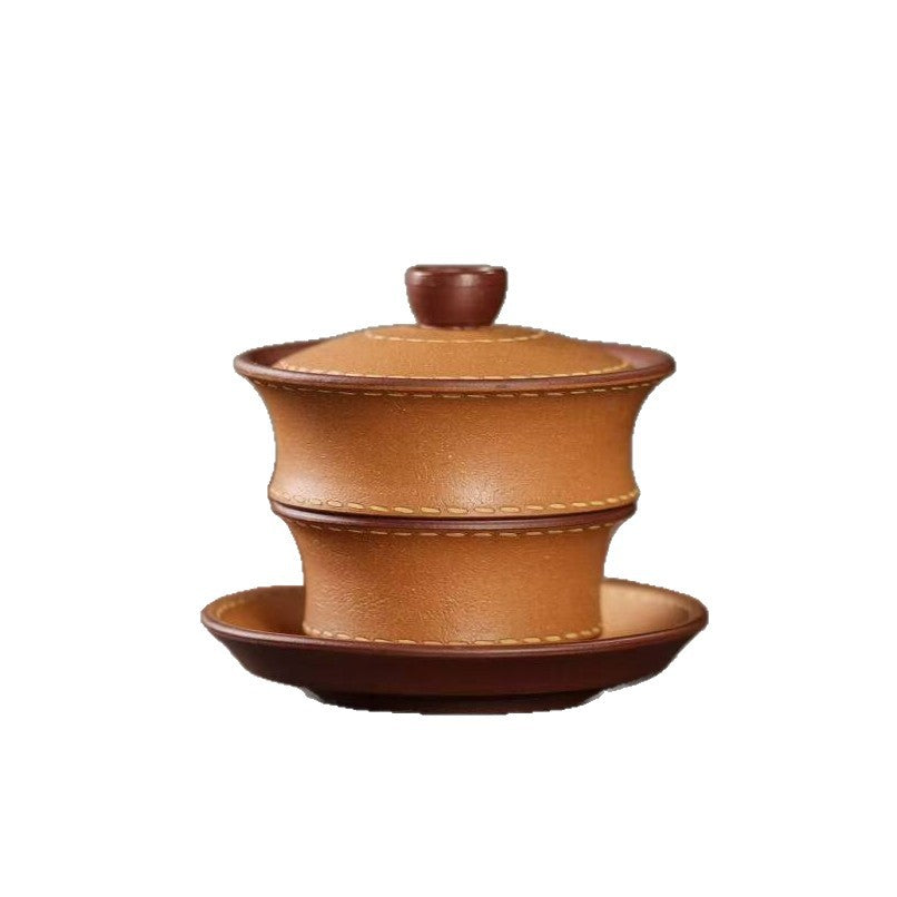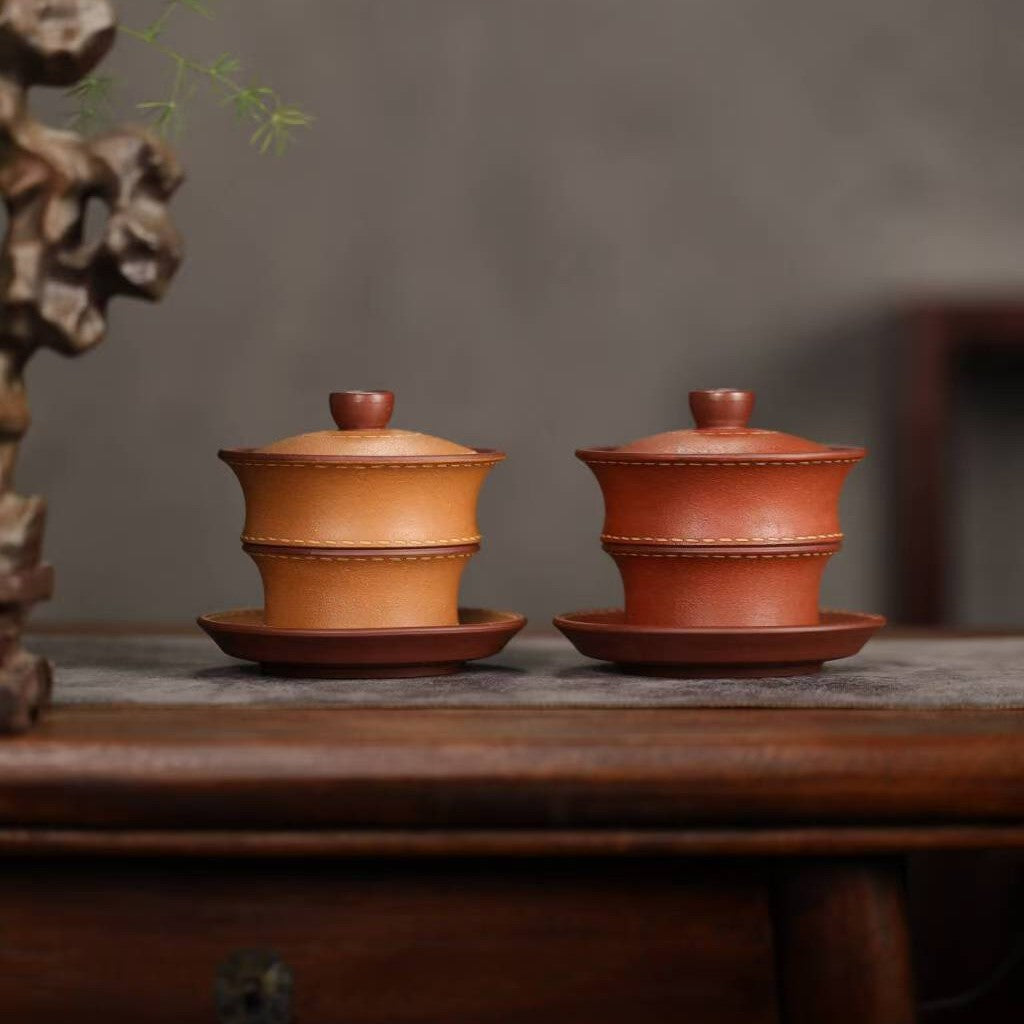宜兴紫砂三才盖碗150CC/110CC创意皮革纹功夫茶具茶杯双色粉浆