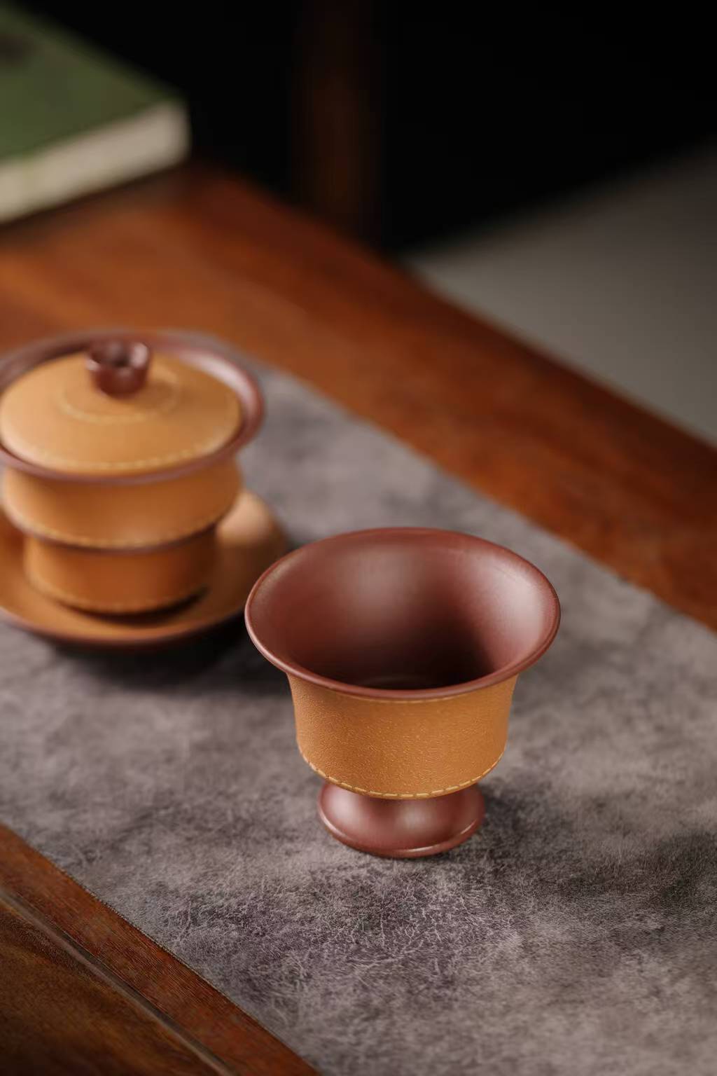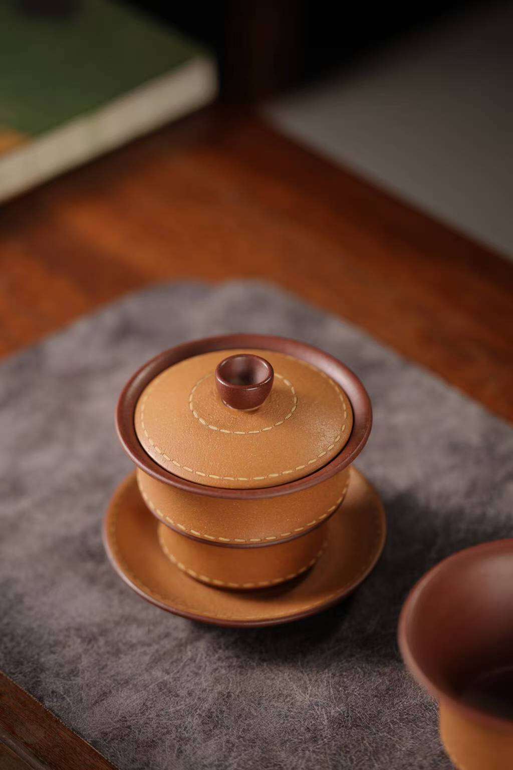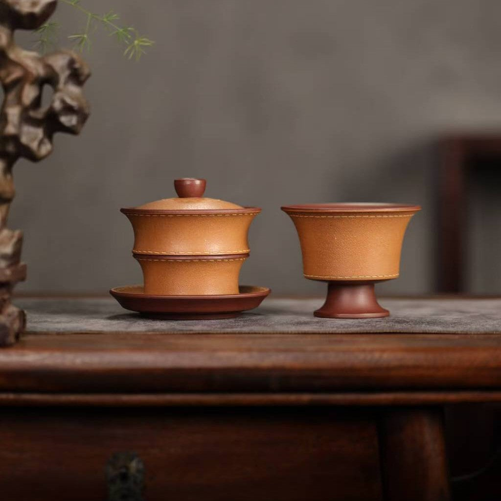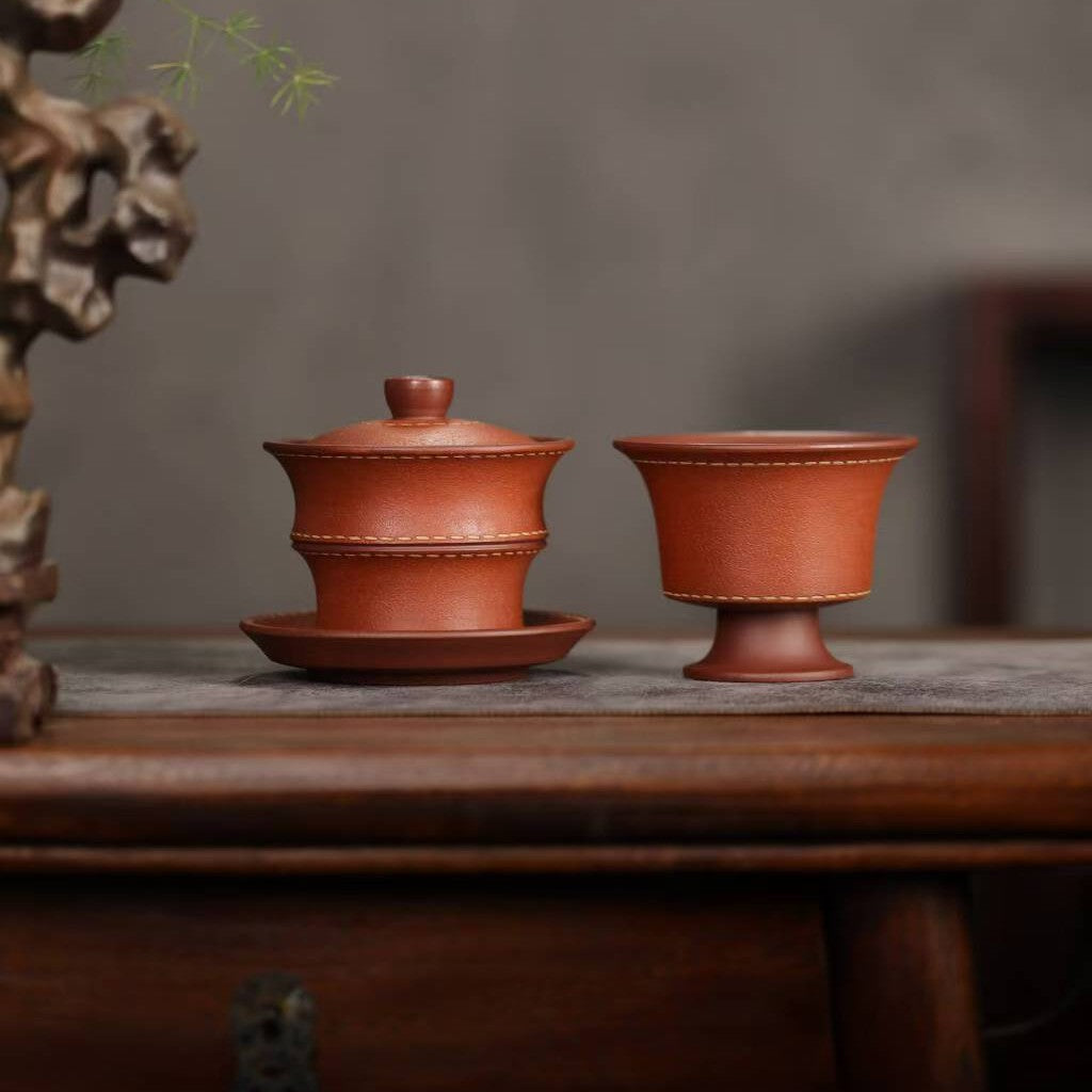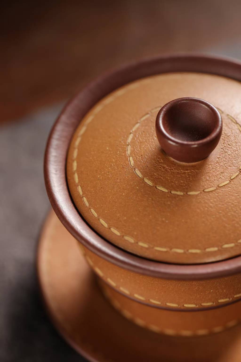 宜兴紫砂三才盖碗150CC/110CC创意皮革纹功夫茶具茶杯双色粉浆