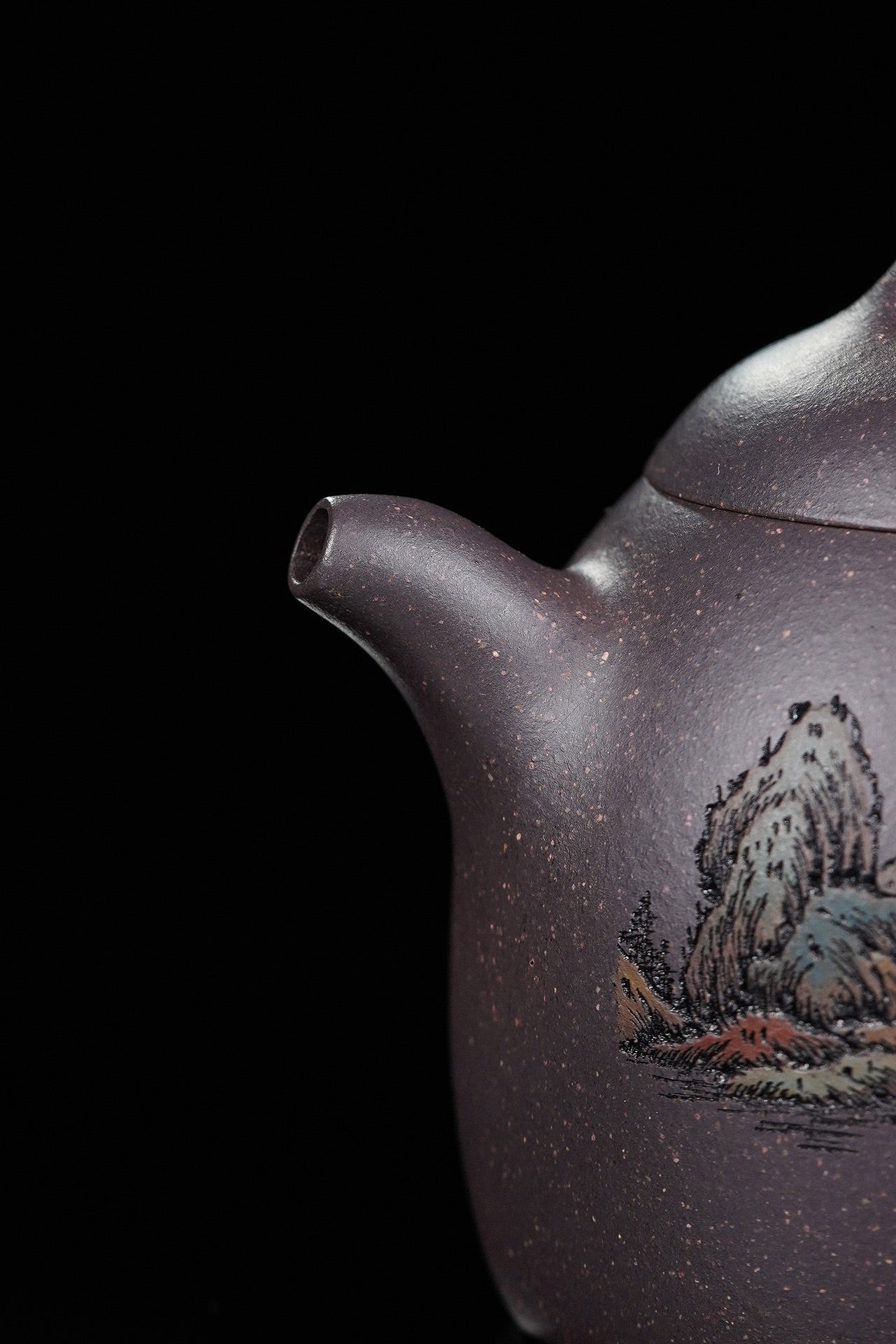 壶身浓缩千里江山:层峦叠嶂为靠山,寓意基业稳固、步步高升;蜿蜒流水为财源,象征源远流长、生生不息;苍松翠柏点缀其间,暗含福寿绵长、风骨卓然,山中内容充满无限想象力,仿佛身入山林,让人轻松愉悦。握壶在手,如揽万里山河于掌心,既藏文人雅趣,又纳吉祥福运,是东方美学与人生智慧的完美载体。