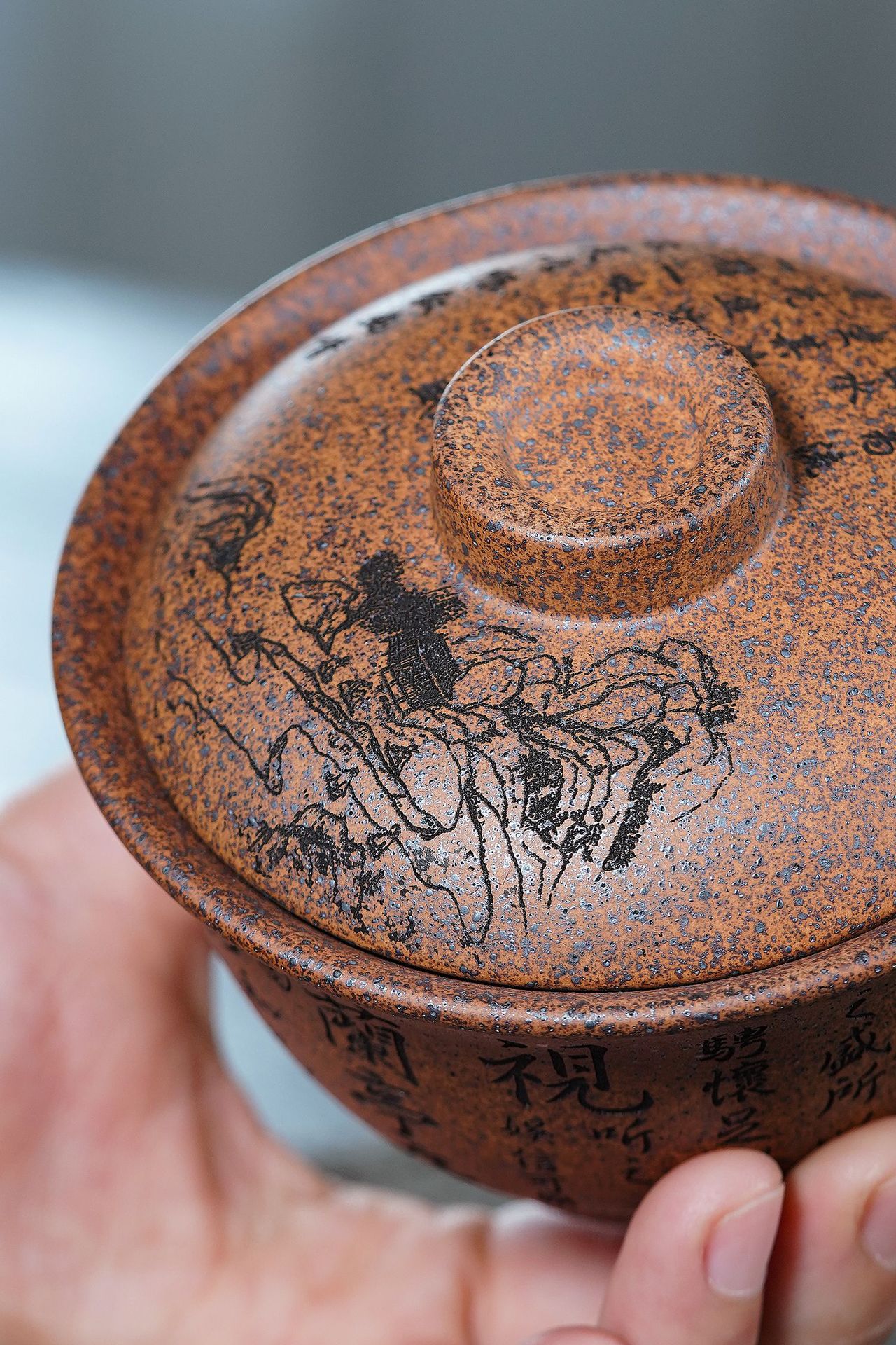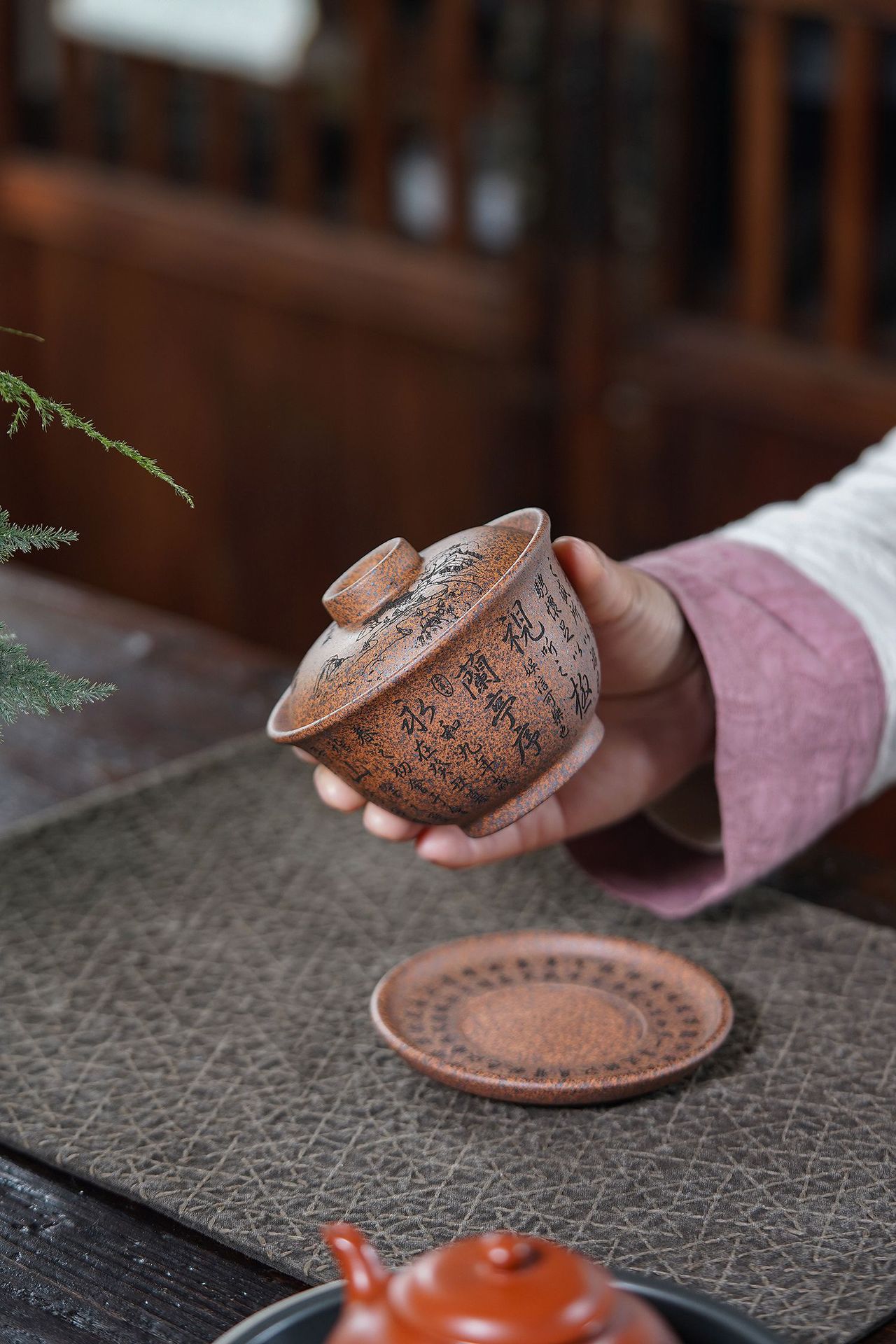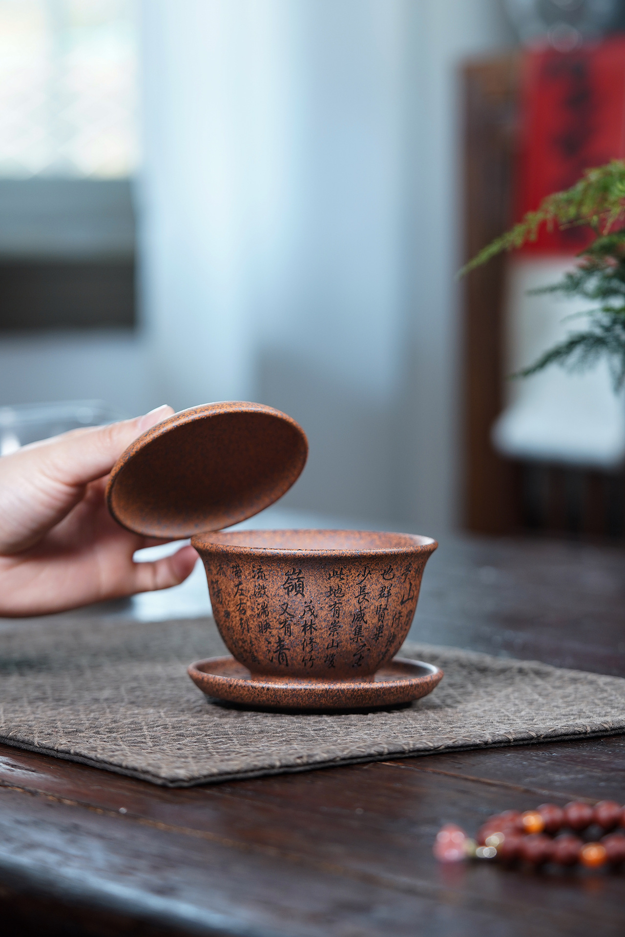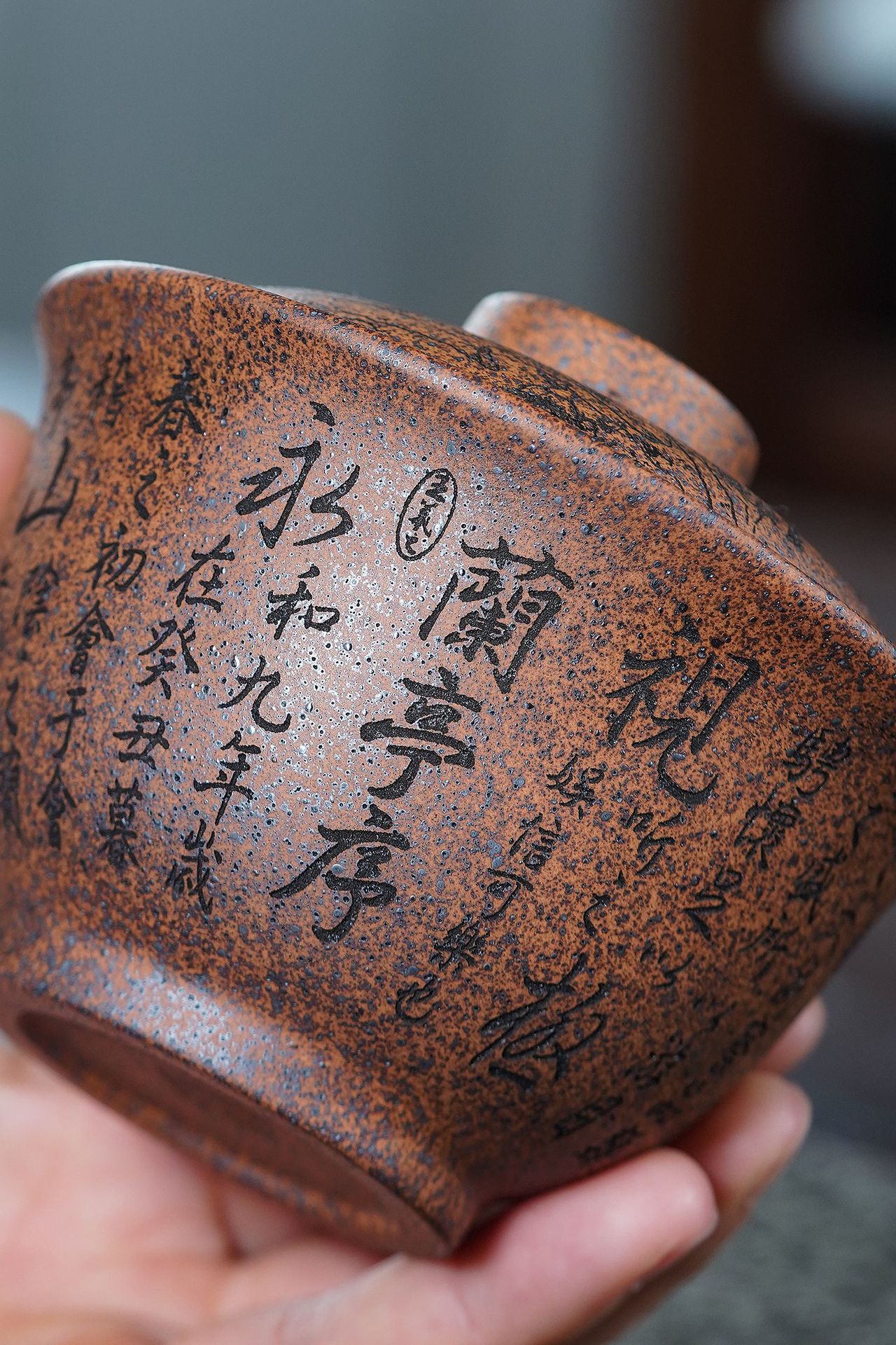 紫砂朱永良盖碗250CC宜兴原矿龙骨金砂柴烧刻绘兰亭序茶经盖碗