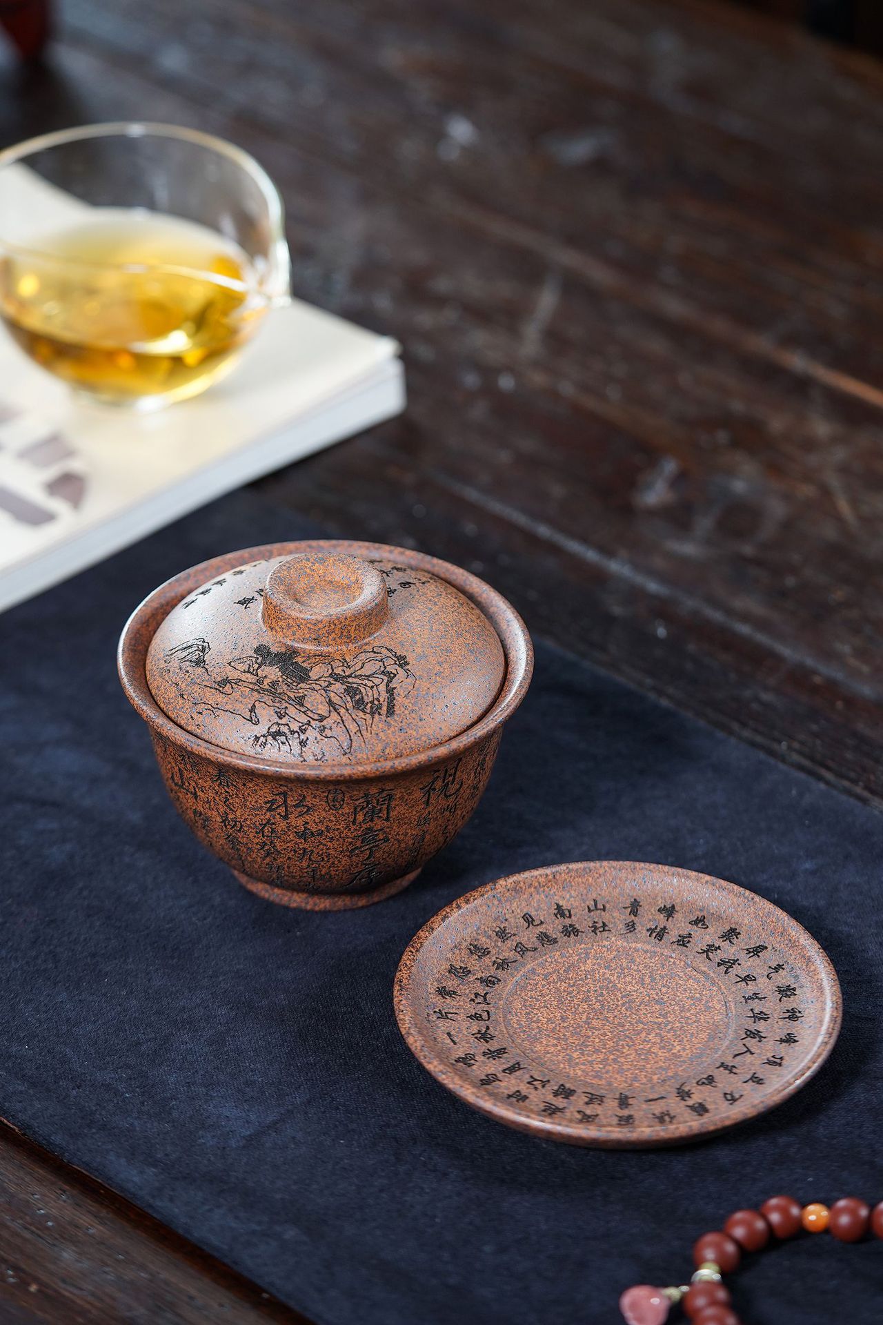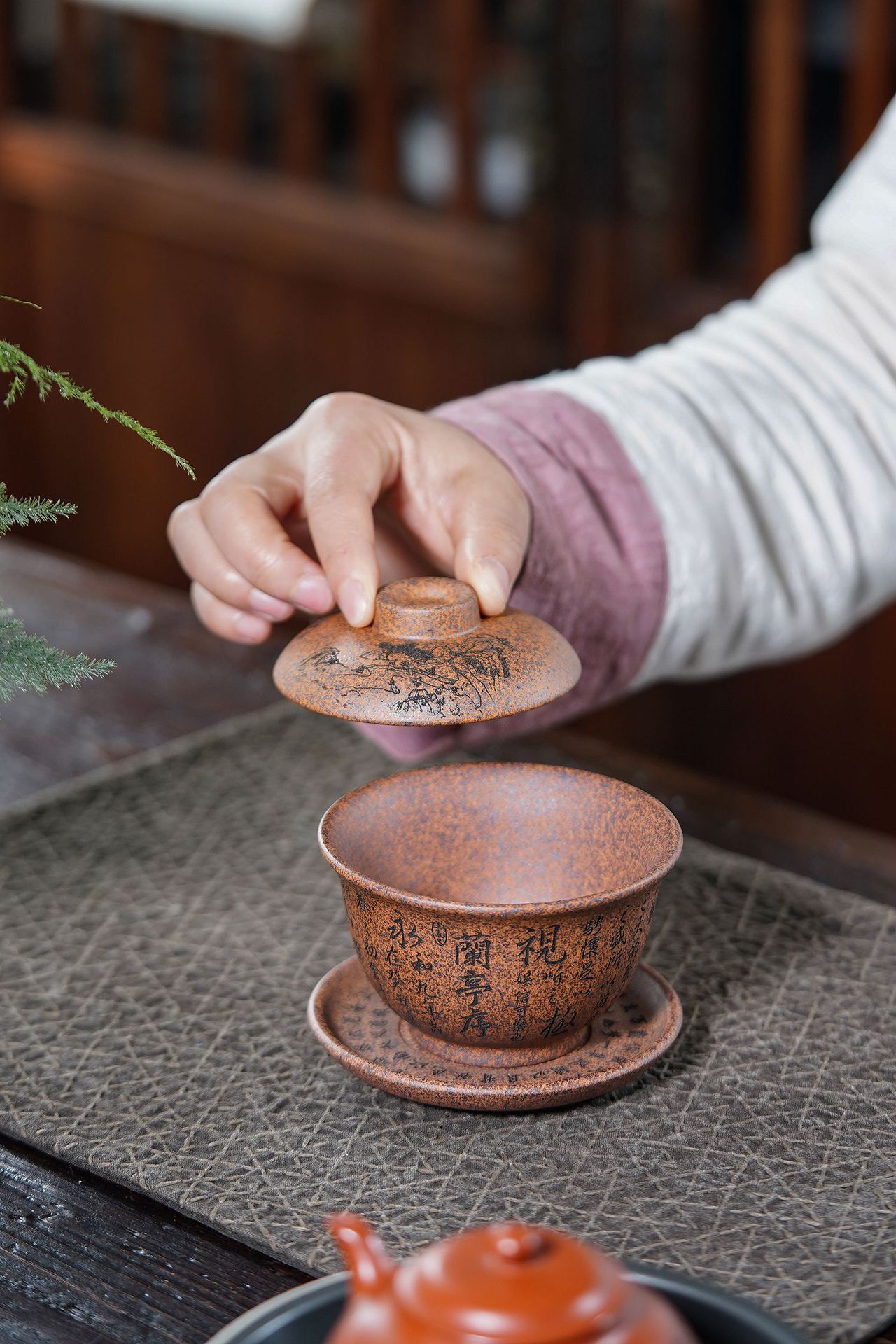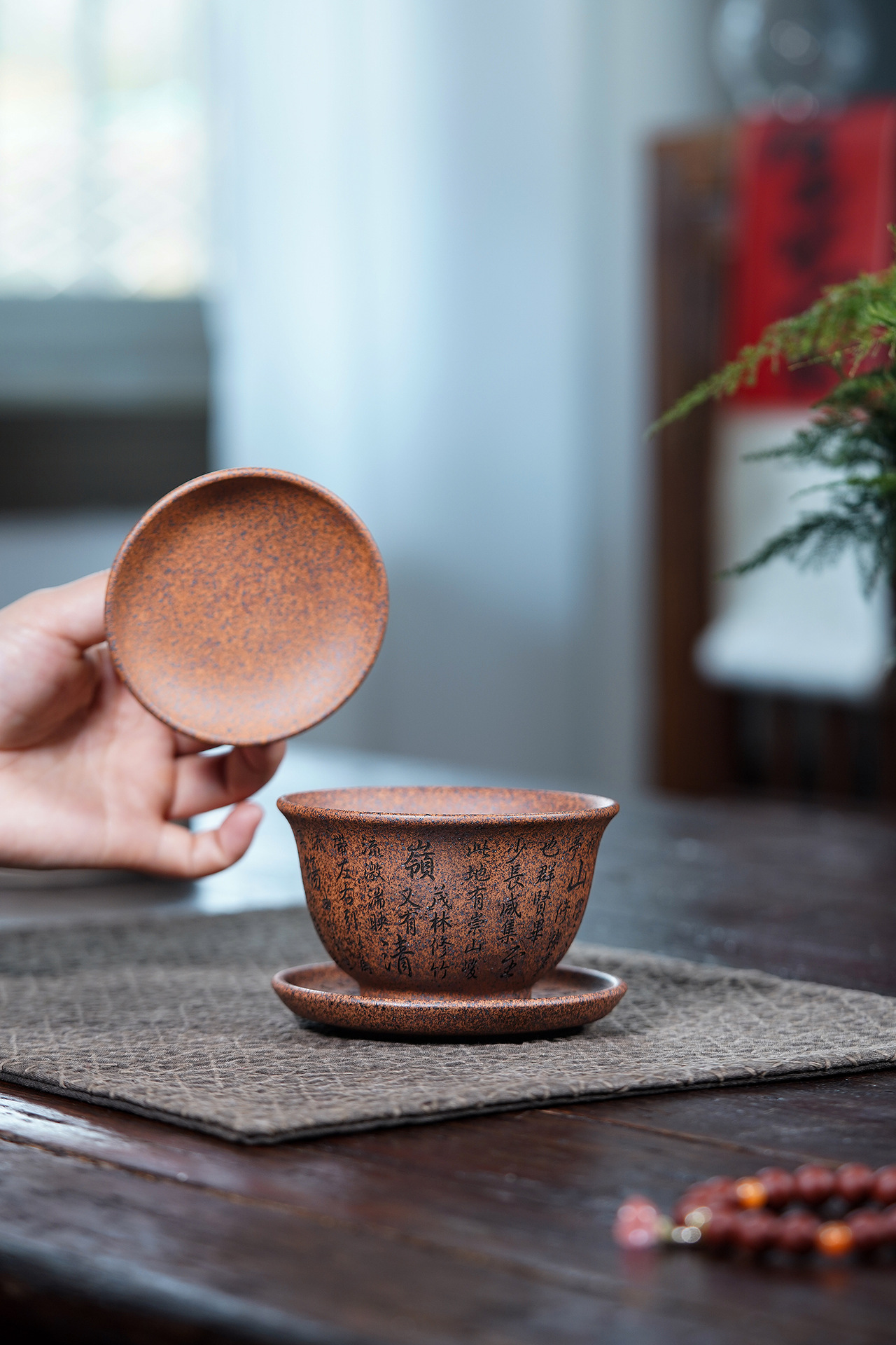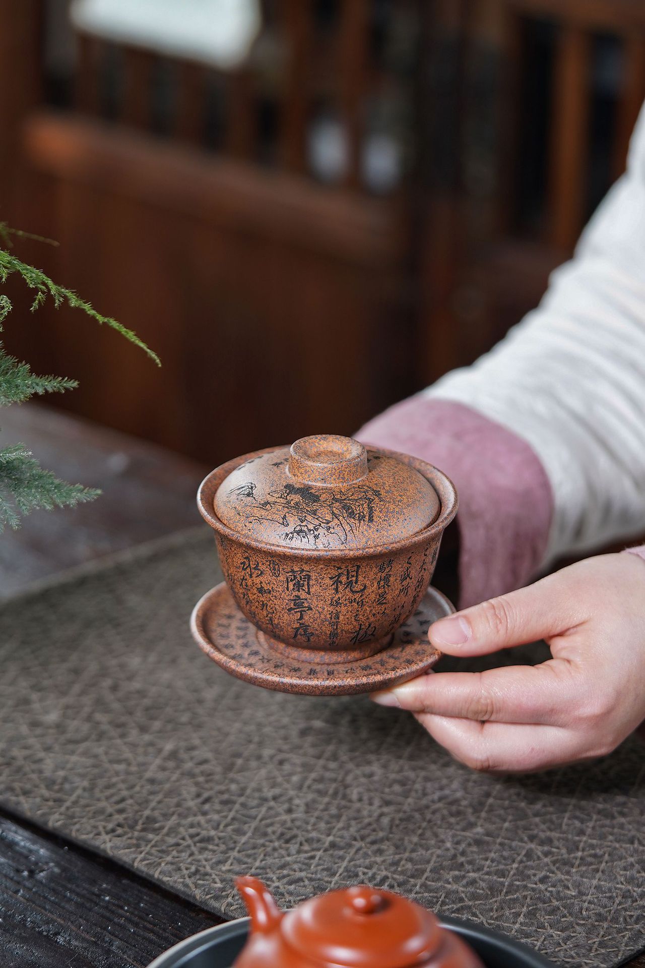 紫砂朱永良盖碗250CC宜兴原矿龙骨金砂柴烧刻绘兰亭序茶经盖碗