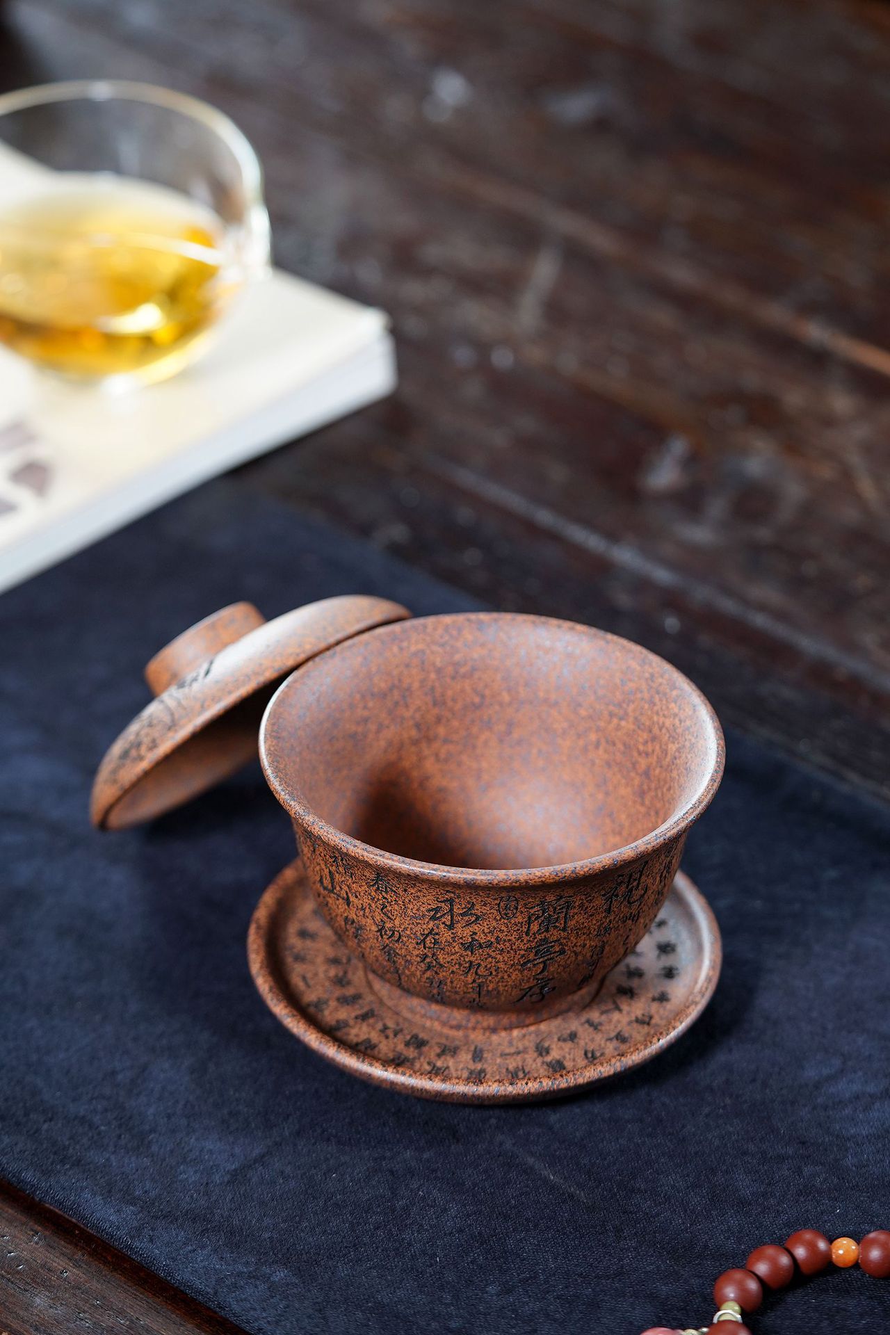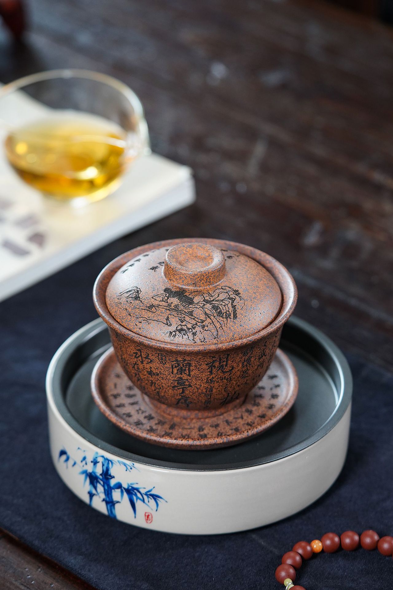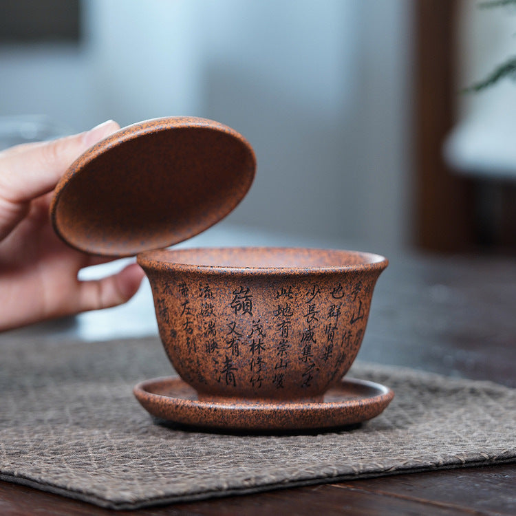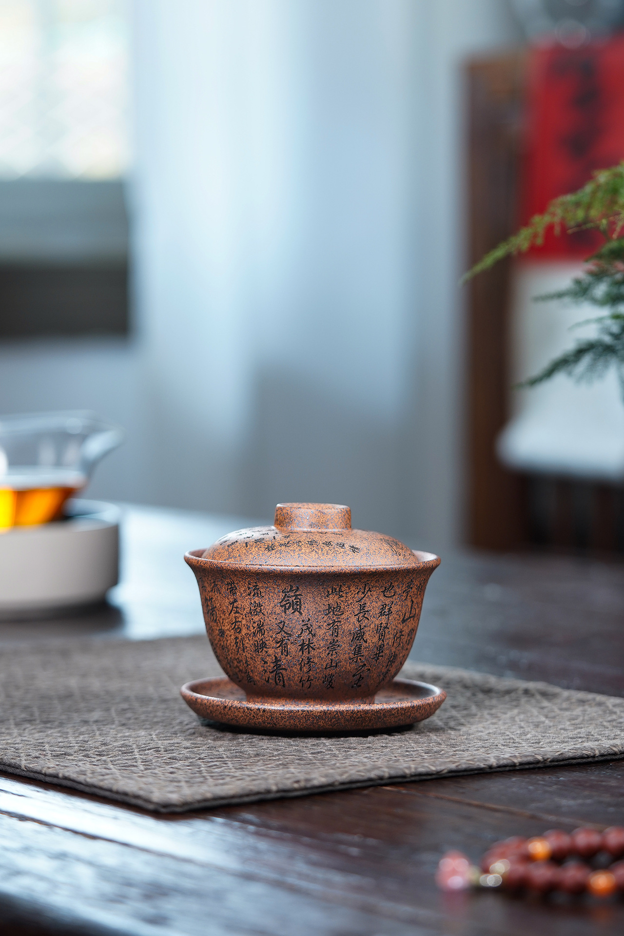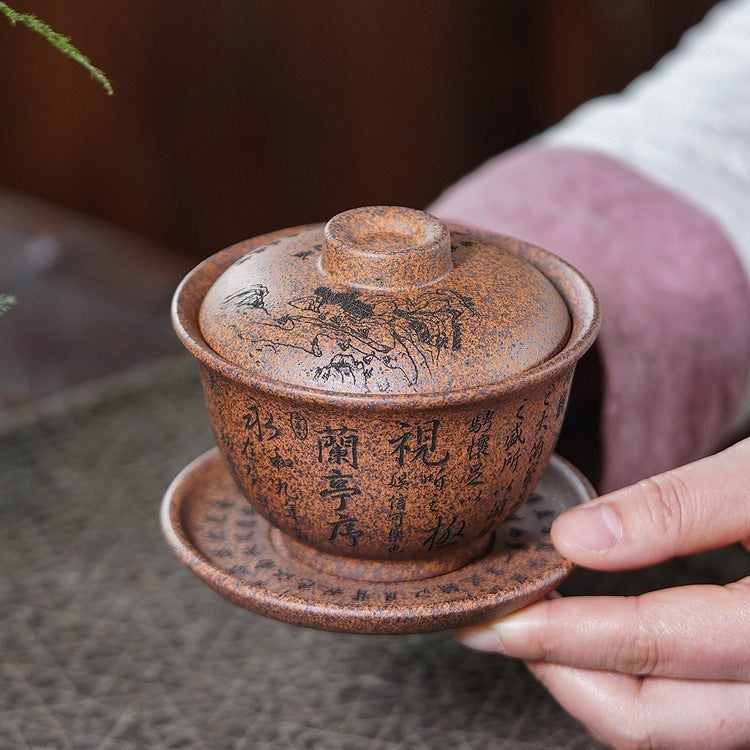 紫砂朱永良盖碗250CC宜兴原矿龙骨金砂柴烧刻绘兰亭序茶经盖碗